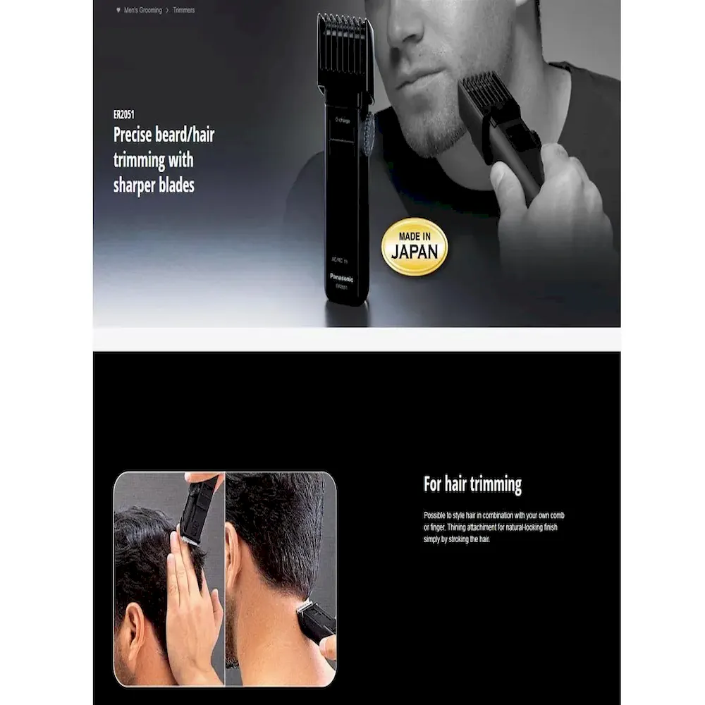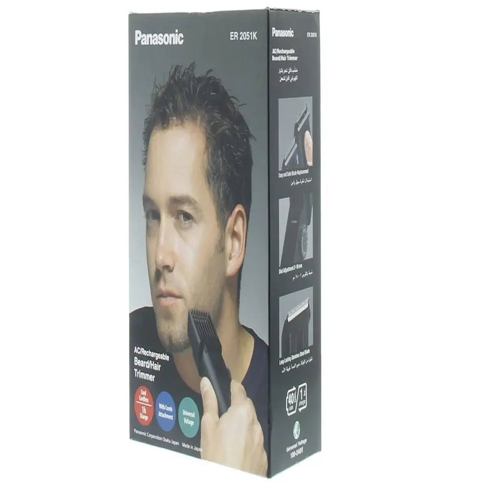 The Panasonic ER2051 Beard & Hair Trimmer is a reliable grooming solution designed for easy and precise styling. With 12 adjustable cutting lengths from 2 to 18 mm, it’s ideal for trimming both hair and beards. The acute 45° stainless steel blades offer sharp, efficient cutting, while the option for corded or cordless use adds flexibility. Rechargeable in just 1 hour, it provides up to 40 minutes of cordless trimming, making it perfect for home or travel use.