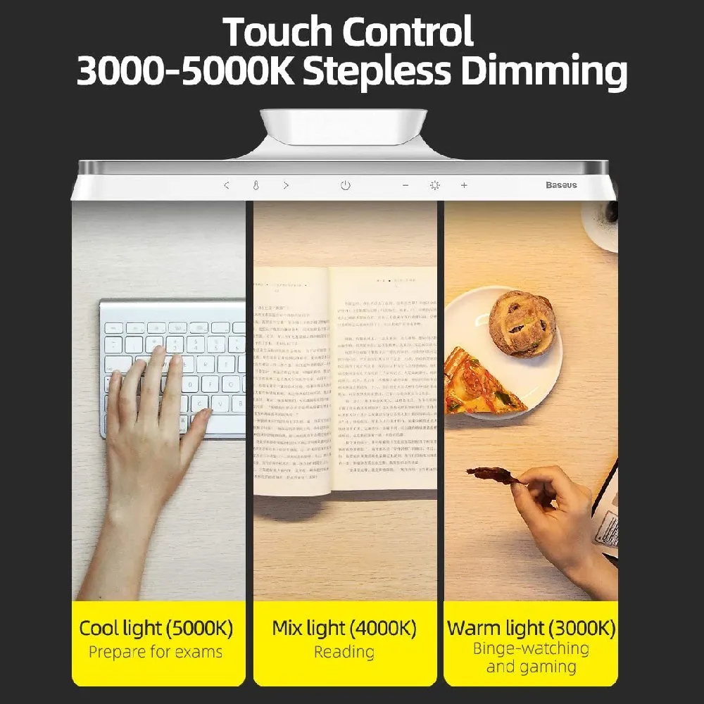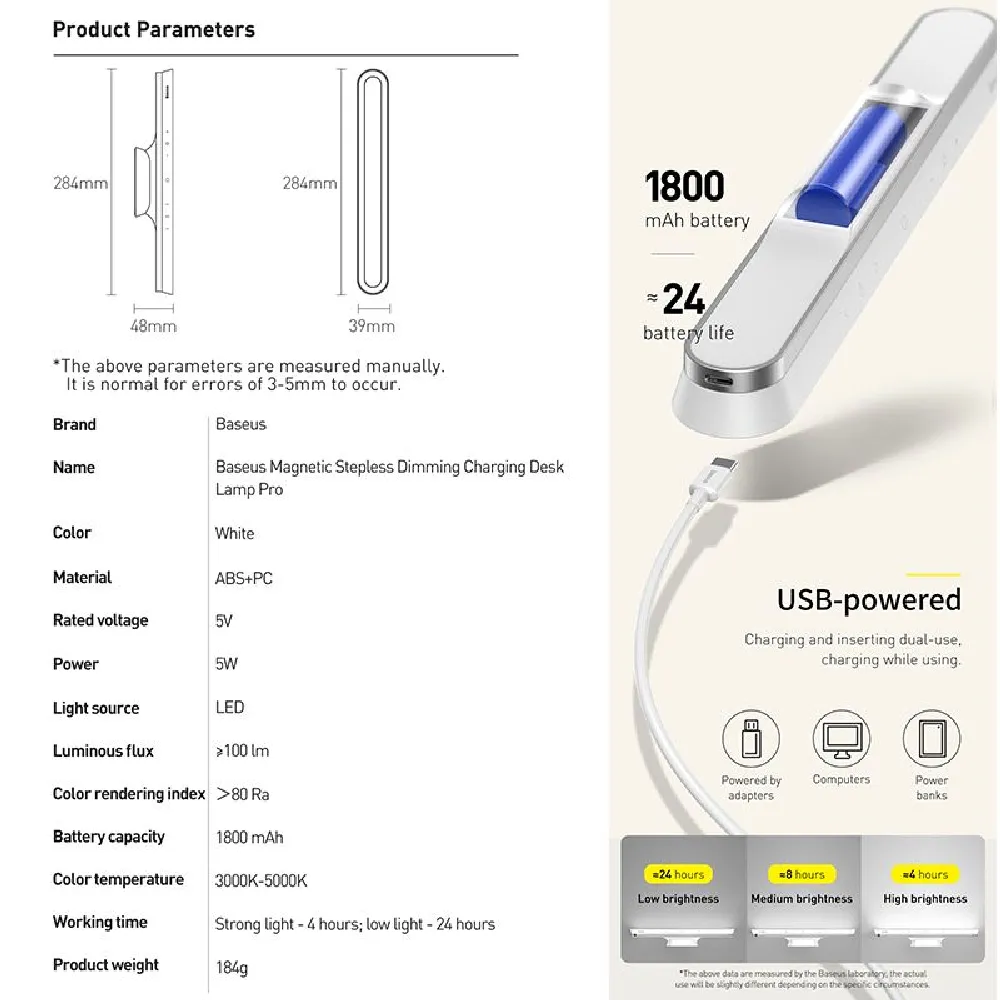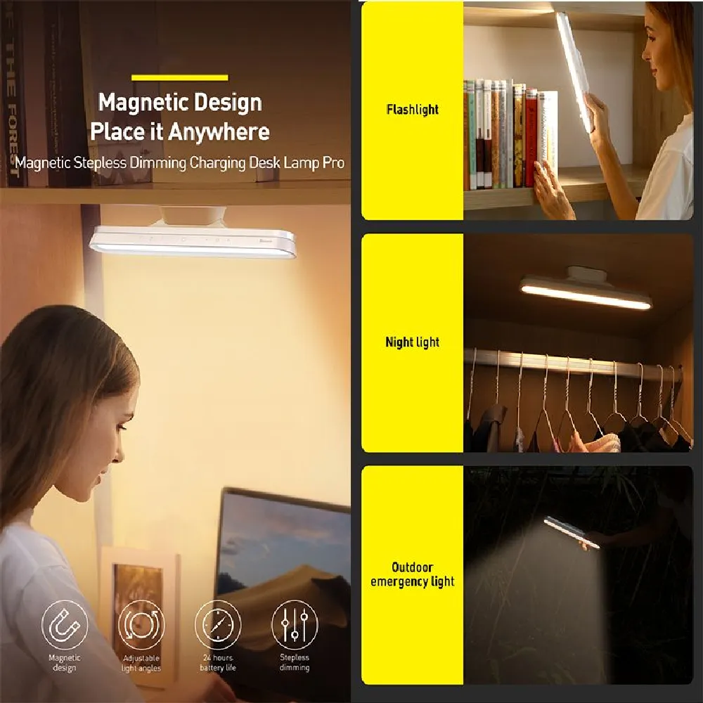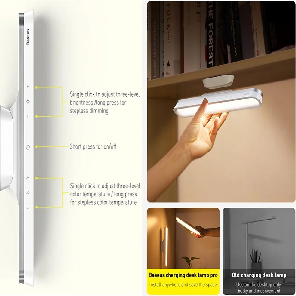 The stylish and space-saving lighting solution designed for modern workspaces and study areas. Its innovative magnetic base allows easy attachment to shelves or walls, freeing up valuable desk space. With stepless brightness and color temperature adjustment, it adapts perfectly to your lighting preferences—whether for reading, working, or relaxing. Powered by a built-in 1800mAh rechargeable battery, it provides up to 24 hours of continuous lighting, making it reliable and portable. Designed with both aesthetics and function in mind, this lamp offers flexibility, efficiency, and elegance in one compact device.
