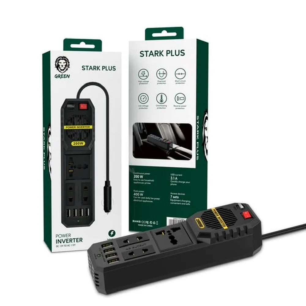 The Green Stark Plus Power Inverter is a reliable solution for powering your devices on the go. With a 200W output and four 3.1A USB-A ports, it allows you to charge multiple devices simultaneously while traveling. Built-in safety features, including high voltage, overload, short circuit, overheating, and reverse connection protection, ensure worry-free operation. The inverter converts your car’s DC 12V power to AC 110V, making it compatible with a wide range of electronics. A built-in cooling fan keeps the device running efficiently, preventing overheating during extended use. Compact and durable, it fits easily in your car and is ideal for road trips, camping, or emergency power needs.