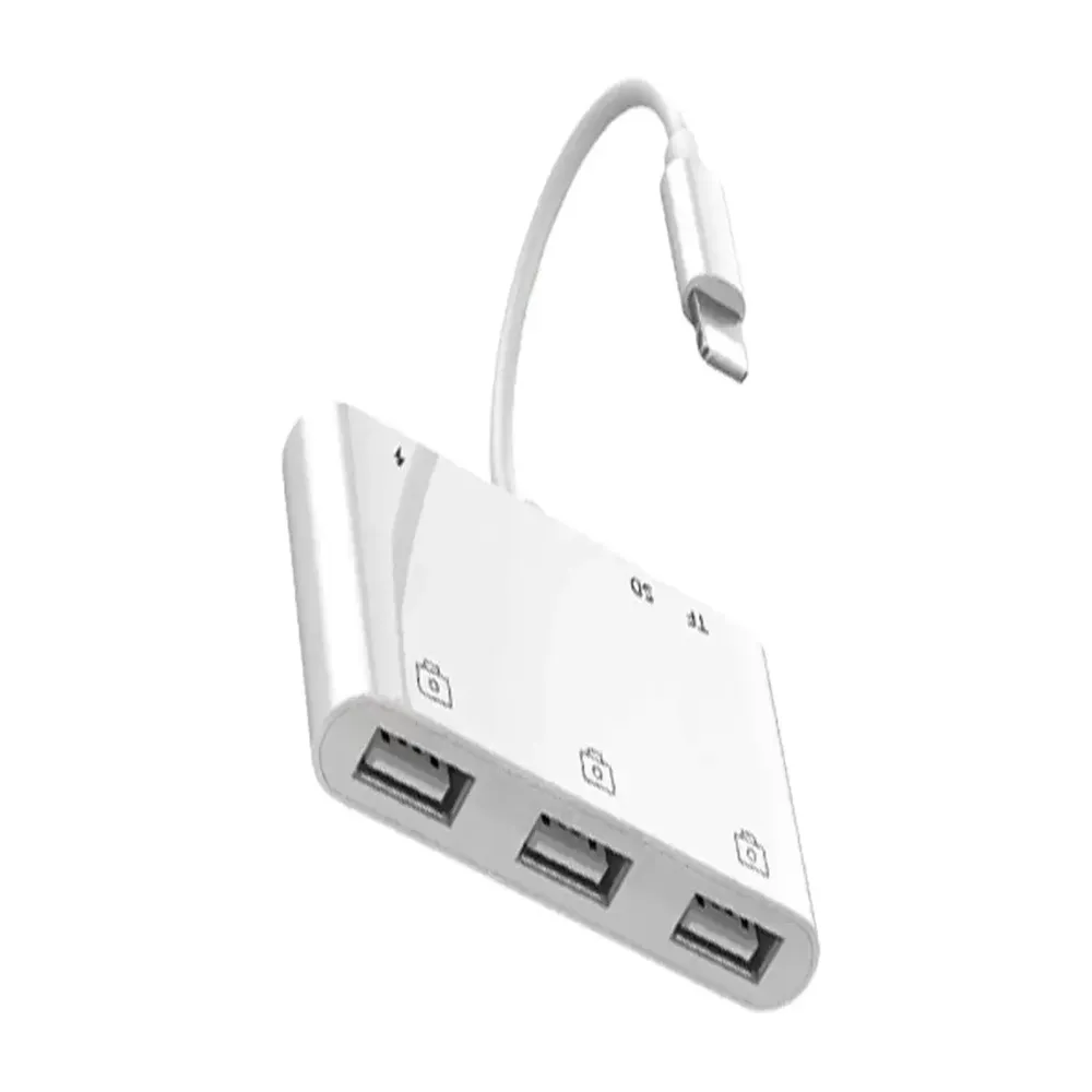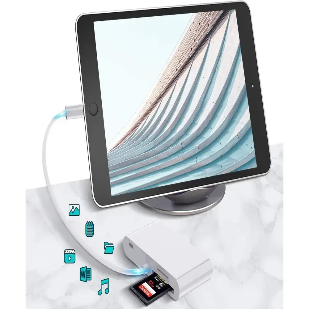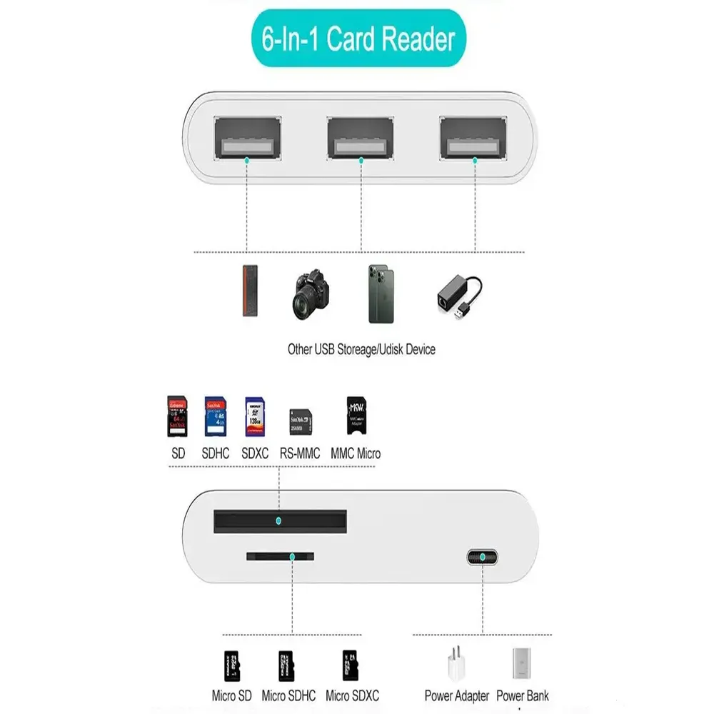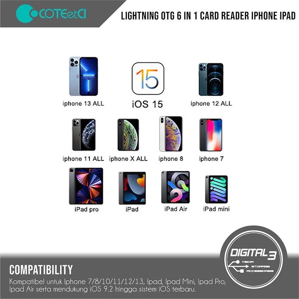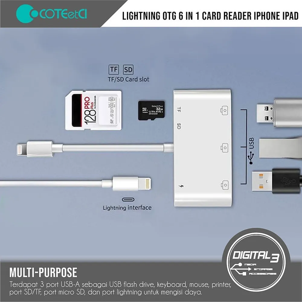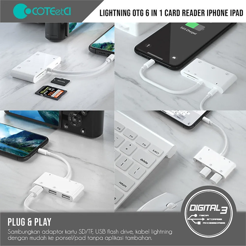 The Coteetci 6-in-1 Lightning OTG Card Reader is a versatile accessory designed to make data transfer seamless for iPhone and iPad users. With support for SD, TF, and USB devices, it lets you easily import photos, videos, and files from cameras or memory cards directly to your device. It delivers fast transfer speeds of up to 16MB/s and supports memory cards up to 256GB, making it perfect for professional photographers, students, and travelers. The reader also supports USB peripherals such as keyboards, mice, and flash drives, turning your device into a more productive tool. Compact and plug-and-play, it requires no apps, ensuring quick and hassle-free use anytime, anywhere.