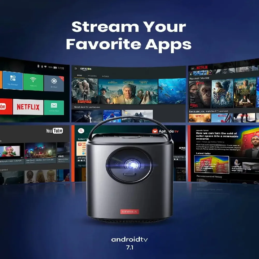 Transform any space into a cinema with the NEBULA Mars II Pro, a powerful and portable projector designed for ultimate entertainment on the go. With 500 ANSI lumens of brightness and DLP IntelliBright technology, it delivers vivid, crisp visuals even in dimly lit environments. Its dual 10W speakers create immersive audio, making movie nights feel larger than life. Built-in Android 7.1 gives you access to thousands of apps, while the Nebula Connect app turns your phone into a smart remote. Whether you're indoors or outdoors, this projector is built for versatility, ease of use, and unforgettable viewing experiences.