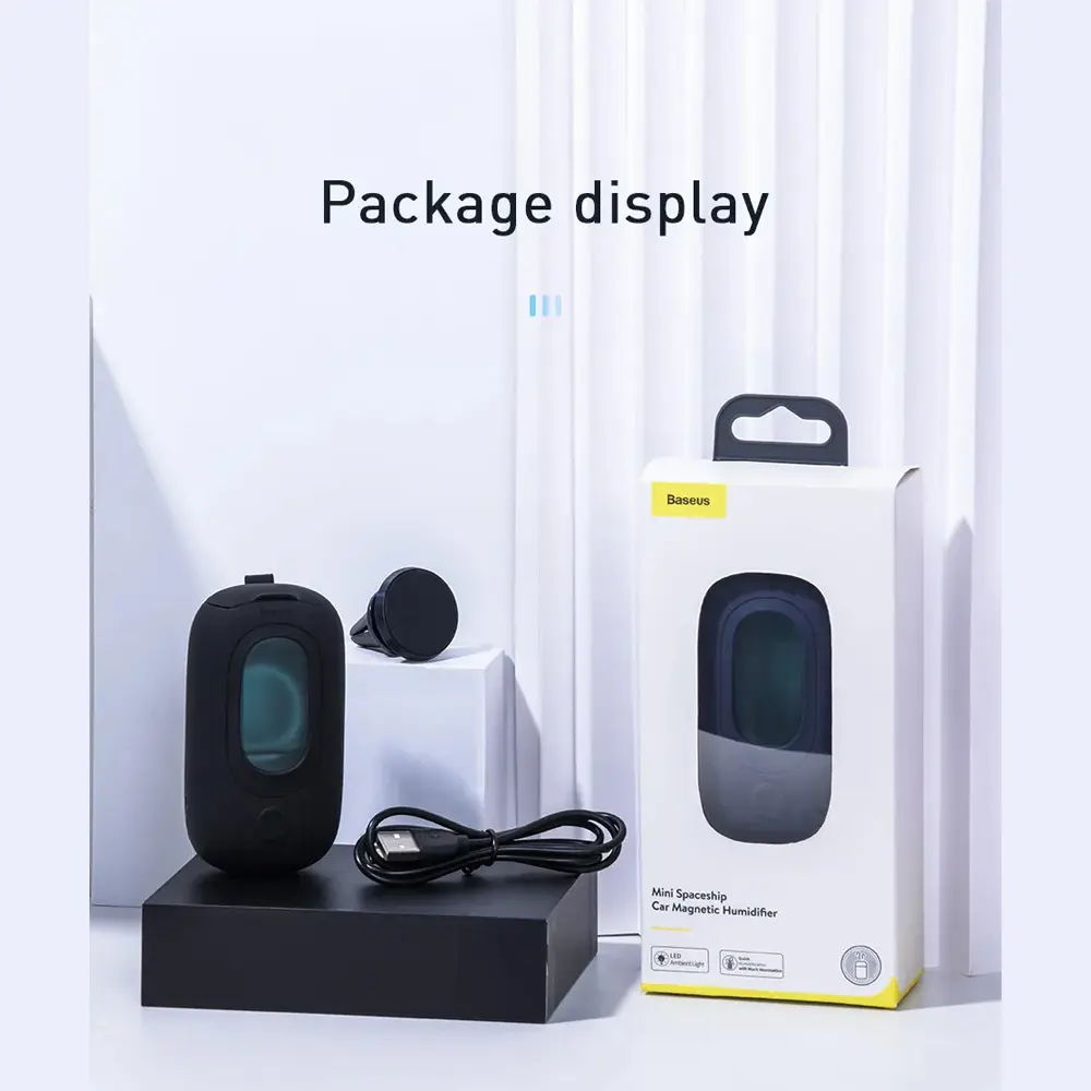 Baseus Mini Spaceship Car Magnetic Humidifier Product Material: silicone + PC + ABS Rated Power. Suitable for both hand-held and air outlets Mini Spaceship Car Magnetic Humidifier.Large Spray Capacity Rapid Humidification.Free Operation Magnetic Suction Bracket Design