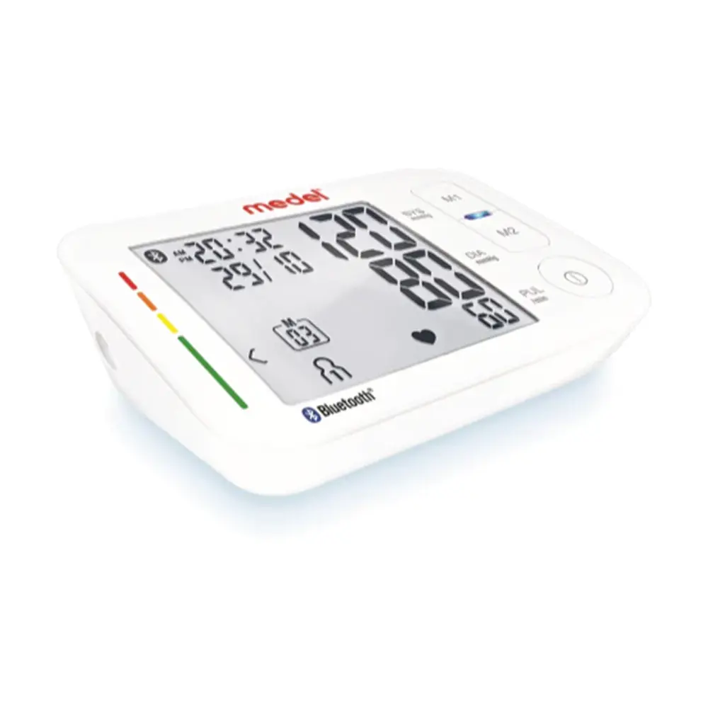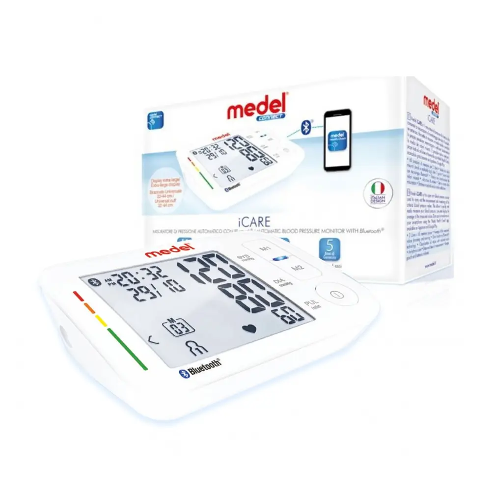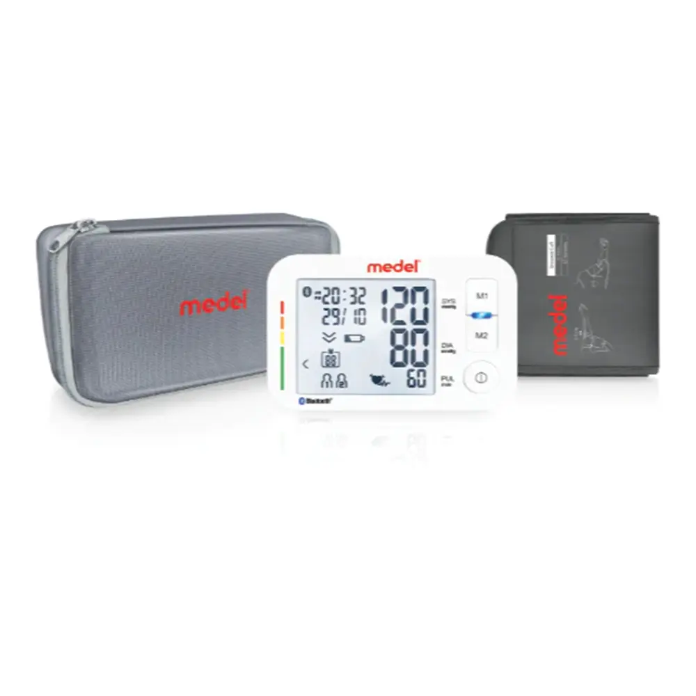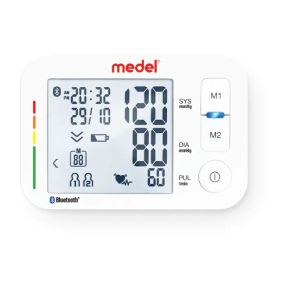 The Medel iCARE Automatic Blood Pressure Monitor offers a smart, user-friendly way to track and manage your heart health at home. Designed for upper arm use, it provides accurate readings with minimal effort and features Bluetooth connectivity to sync your data with the “Medel Health Check” app on both Android and iOS devices. It supports two users and stores up to 60 measurements per person, making it ideal for shared use. The large display ensures easy reading of results, while features like arrhythmia detection and 7-day averaging provide deeper health insights. A colored scale classifies blood pressure levels clearly, helping users understand their results instantly.