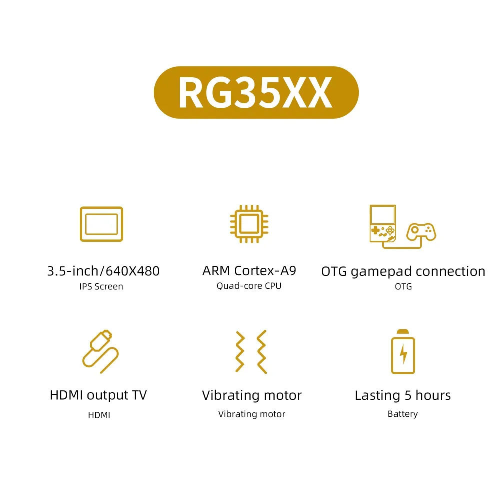 Step into nostalgia with the RG35XX Portable Console, a compact gaming powerhouse preloaded with over 5000 classic games across 15+ emulation platforms. Whether you're into arcade, action, racing, or adventure titles, this device has something for every retro gaming fan. Featuring a bright 3.5-inch IPS screen with 640 × 480 resolution, it delivers crisp visuals and vivid gameplay. Its dedicated operating system offers save/load functions, multiplayer support, and smooth performance, all optimized for seamless gaming on the go. With a powerful ARM Cortex-A9 Quad-Core CPU, HDMI TV output, and OTG gamepad connection, it’s built for both solo and shared gaming experiences. The 2600mAh battery ensures up to 6 hours of playtime, and Type-C charging makes it convenient and quick to recharge. Compact, lightweight, and travel-ready—this console is perfect for gamers of all ages.
