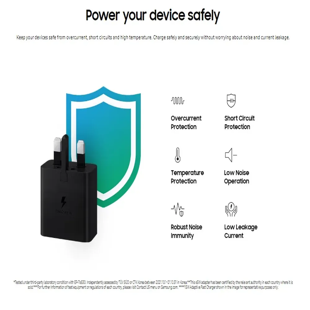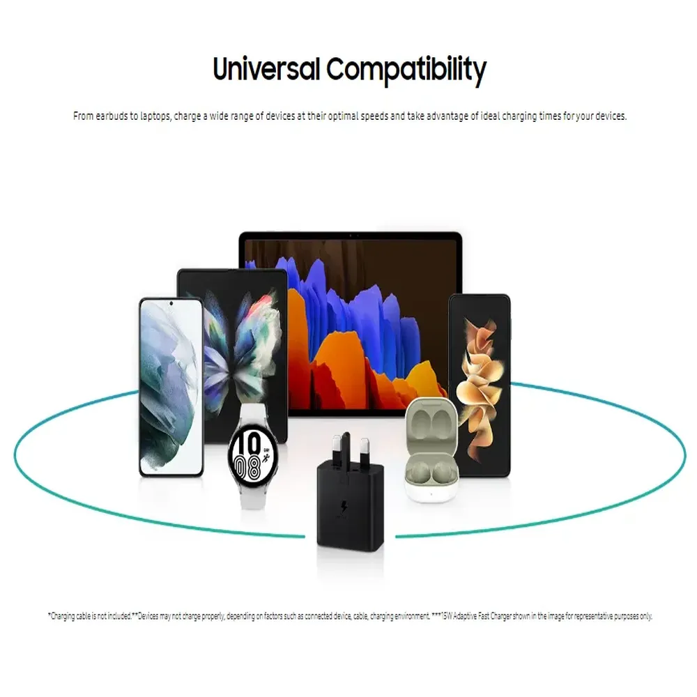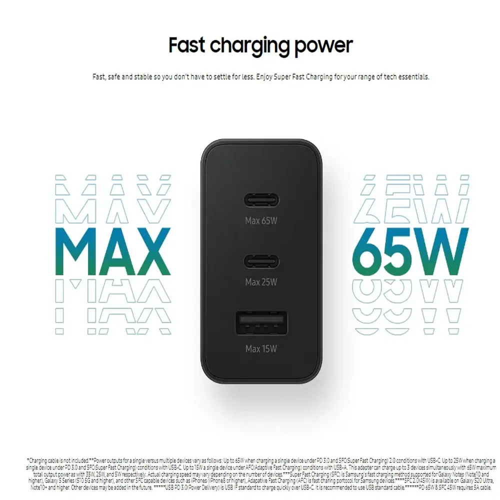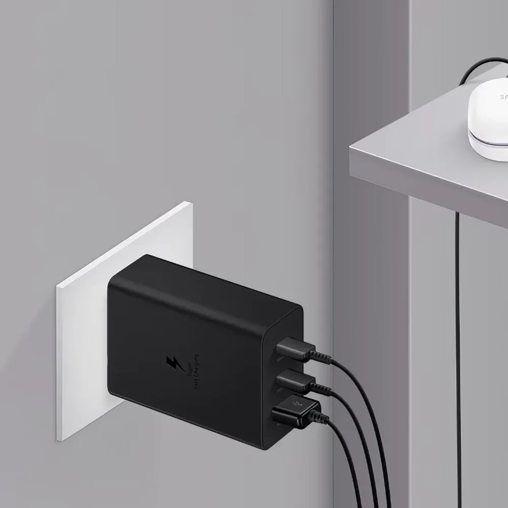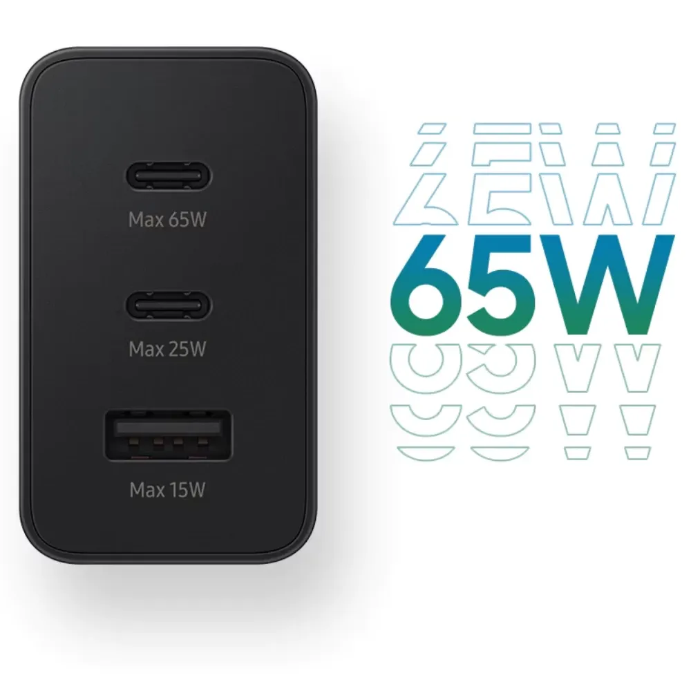 The Samsung 65W Charger Trio delivers powerful and efficient charging for multiple devices at the same time. With two USB-C ports and one USB-A port, you can charge your phone, tablet, and accessories together without slowing down. Built with premium safety protections and wide compatibility, it ensures fast and secure charging for Samsung smartphones and many leading brands. Its compact design makes it perfect for travel, work, and home use — a must-have accessory for anyone relying on fast power.