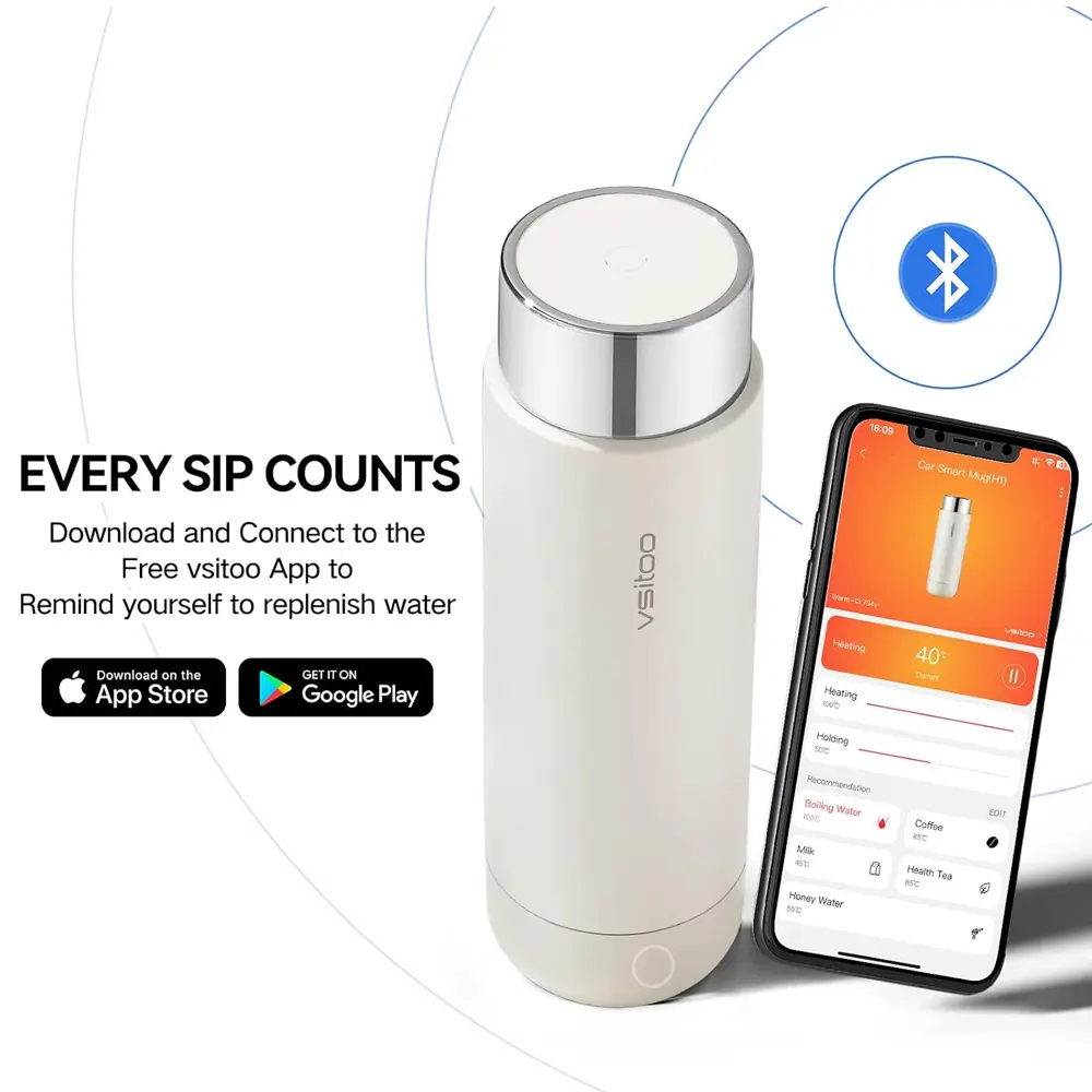 The Vsitoo Smart Car Heating Bottle brings convenience and warmth to your travels, allowing you to boil water or enjoy hot beverages directly in your vehicle. With one-key operation, it quickly heats water while its double-wall stainless steel insulation maintains temperature and prevents burns. The austenitic 316 stainless steel liner and 99.9% antibacterial inner plug ensure safe, hygienic use. Dual voltage intelligent identification (12V/24V) makes it compatible with cars, trucks, and other vehicles. A two-way pressure relief valve adds safety, while the anti-pulling socket and anti-slip silicone bottom ensure stability and ease of use.