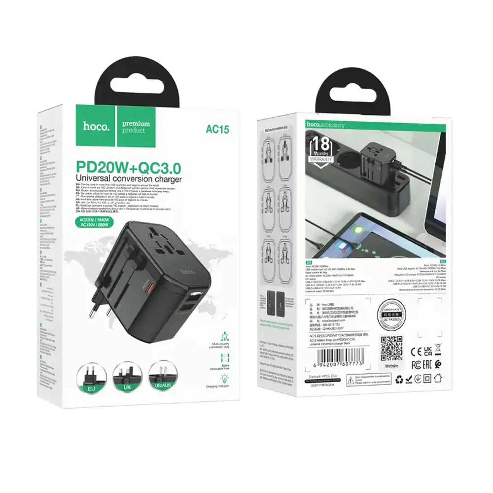 Charge multiple devices quickly and efficiently with the Hoco AC15 Universal Conversion Charger. Featuring one USB-C port with 20W PD fast charging and two USB-A ports with QC3.0 support, it delivers high-speed power to smartphones, tablets, and more. Its universal plug compatibility (EU/UK/US/AUS) makes it the perfect travel companion for global use. Compact and portable, it’s designed for convenience without compromising performance, making it a smart choice for everyday charging needs.