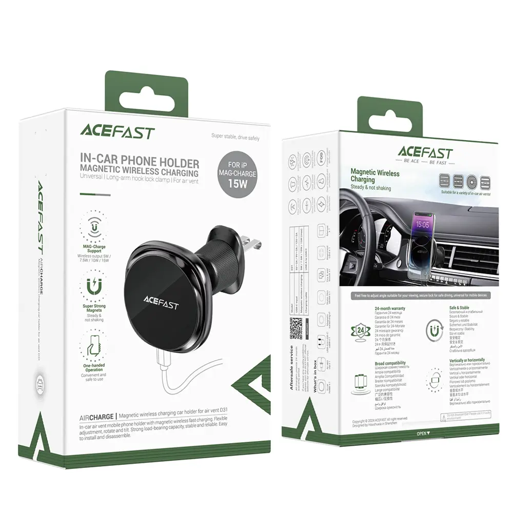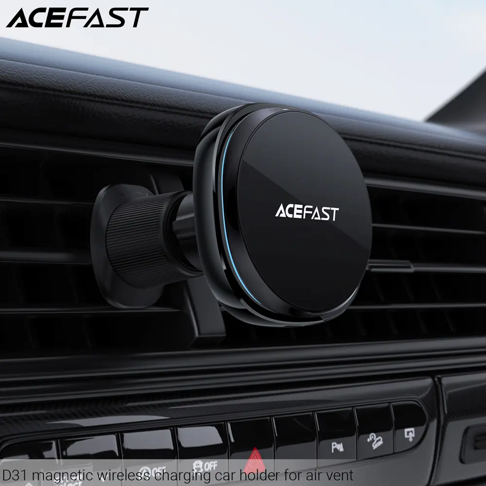 Acefast Magnetic wireless charging car holder for air vent D31 In-car air vent mobile phone holder with magnetic wireless fast charging. Flexible adjustment, rotate and tilt. Strong load-bearing capacity, stable and reliable. Easy to install and disassemble.
