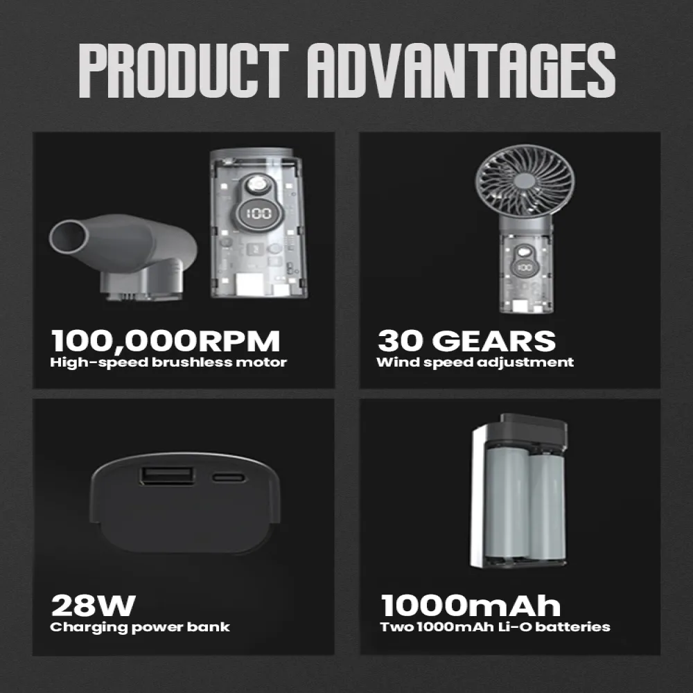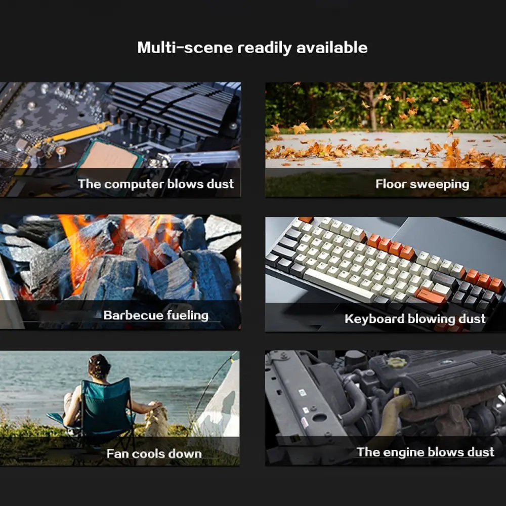The powerful and portable 2-in-1 turbo fan designed to keep you cool wherever you go. Equipped with a high-capacity 10000mAh battery, it delivers strong, adjustable airflow for extended hours without needing constant recharging. Its compact design and one-handed operation make it perfect for gaming setups, outdoor adventures, or everyday use. Beyond cooling, it also features a built-in illumination system, making it a great companion for low-light environments. The multi-functional design supports various scenarios, whether you're indoors or out. Reliable, efficient, and easy to carry, this fan is built to meet all your cooling and lighting needs.