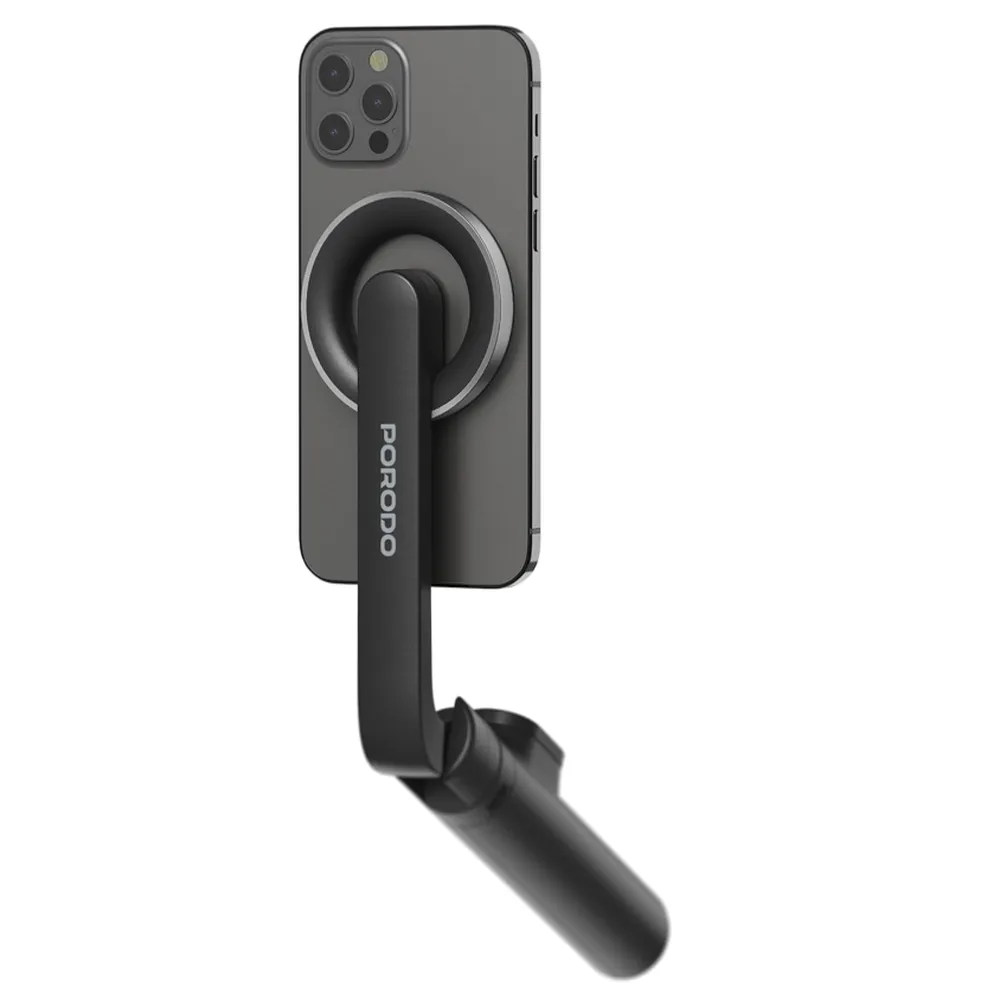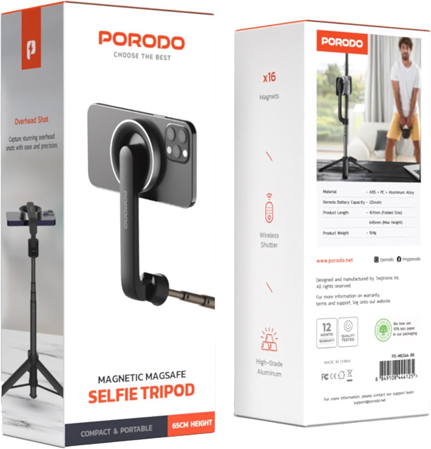 Capture perfect photos and videos effortlessly with the Porodo Magnetic Selfie Stick Tripod. Its 64.5cm extendable design and three-leg tripod provide stable support for your smartphone, while 16 strong magnets keep your device securely in place. The included wireless remote allows for convenient shutter control, making selfies, group photos, and videos easy and hassle-free. Crafted from high-grade aluminum and durable ABS + PC materials, this tripod is lightweight, portable, and built to last. Ideal for travel, vlogging, or casual photography, it combines stability, versatility, and convenience in one compact tool.
