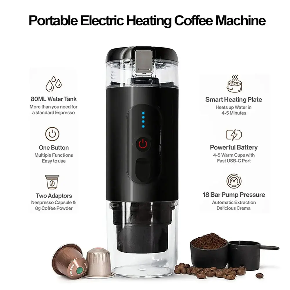Enjoy barista-quality coffee anywhere with the Espresso Coffee Maker, designed for ultimate portability and convenience. With 18-bar pump pressure, it delivers rich, smooth espresso topped with perfect crema in every shot. The wireless heating system and USB Type-C charging make it ideal for travel, office, or outdoor use without needing a power outlet. Its compact stainless steel build ensures durability while providing premium coffee at your fingertips.