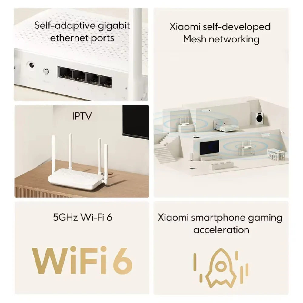 Xiaomi Router AX1500 WiFi 6 delivers ultra-fast connectivity with speeds up to 1500Mbps, designed for smooth streaming, gaming, and everyday browsing. Powered by WiFi 6 technology, it ensures stable connections across multiple devices at once. Self-adaptive gigabit Ethernet ports provide reliable high-speed wired connections, while Xiaomi’s Mesh networking eliminates dead zones for full-home coverage. With built-in gaming acceleration for Xiaomi smartphones and IPTV support, this router offers an optimized and versatile network experience. Easy setup and smart management make it a perfect fit for modern households.