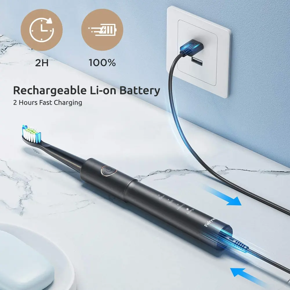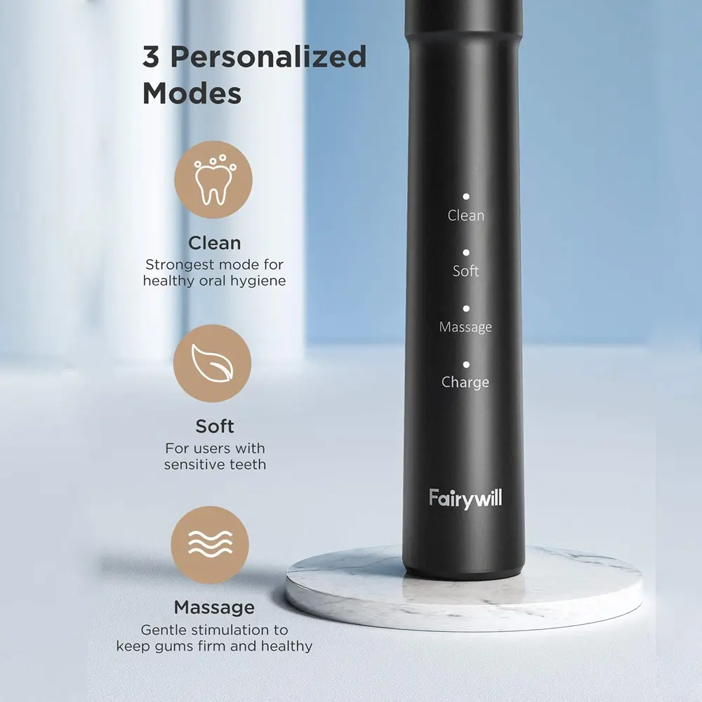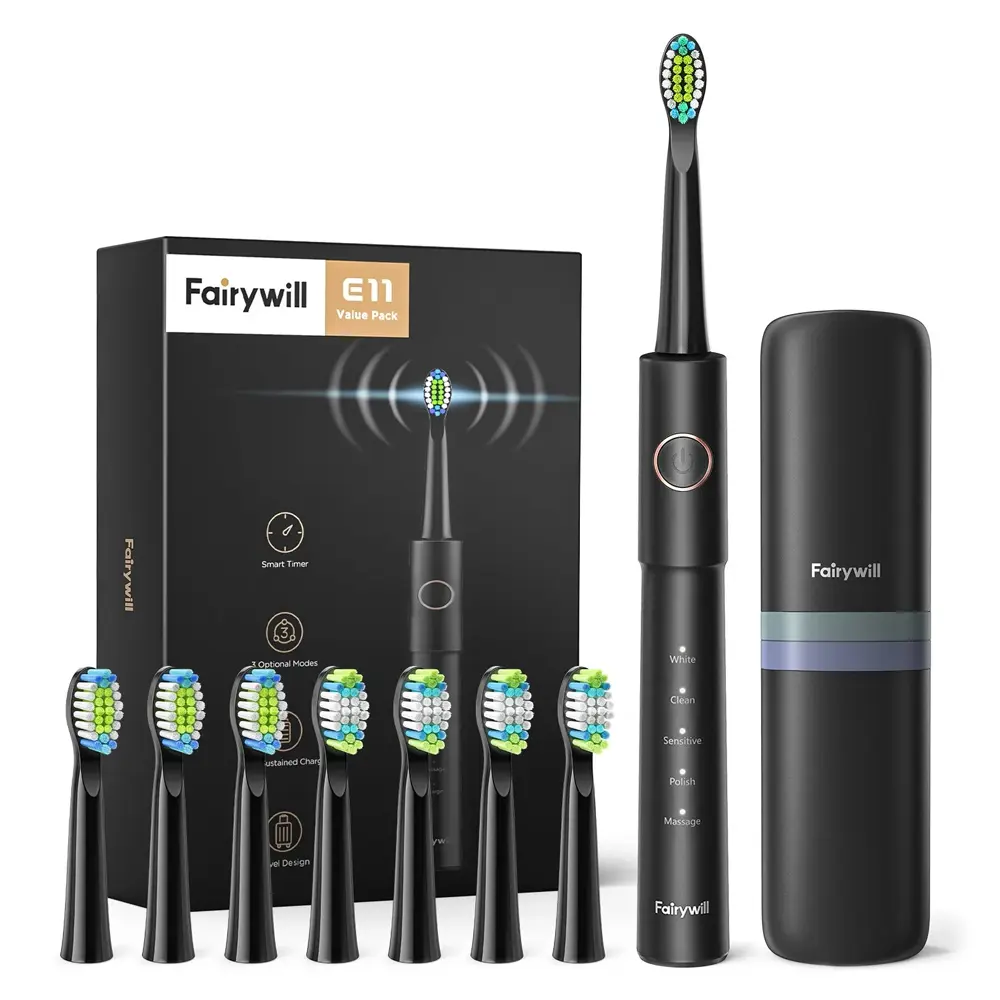 The Fairywill E11 Electric Toothbrush offers powerful and customizable oral care with sonic vibrations reaching up to 40,000 rpm for deep and effective cleaning. Its five brushing modes cater to all dental needs—from sensitive gums to whitening and polishing—making it perfect for every user. The smart timer ensures thorough brushing by guiding you to switch quadrants every 30 seconds and stopping after 2 minutes. With eight replaceable brush heads included, this set provides long-lasting value and convenience. Compact, waterproof, and USB rechargeable, the E11 is designed for both home use and travel, supporting global voltage compatibility.