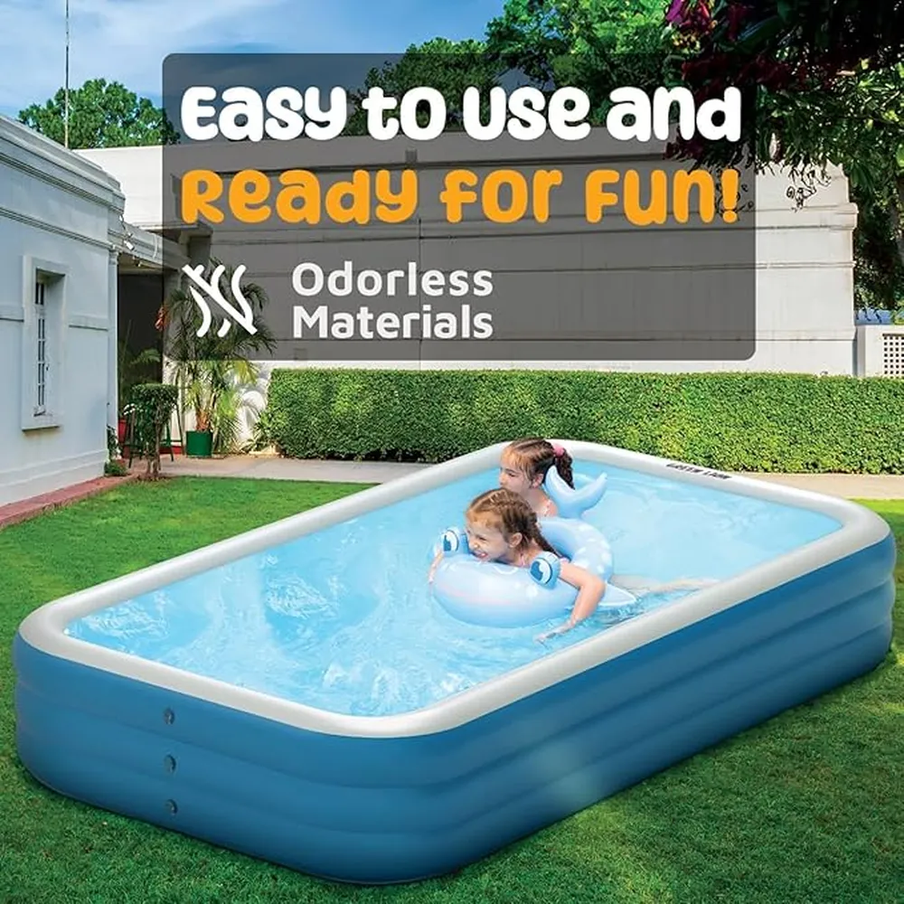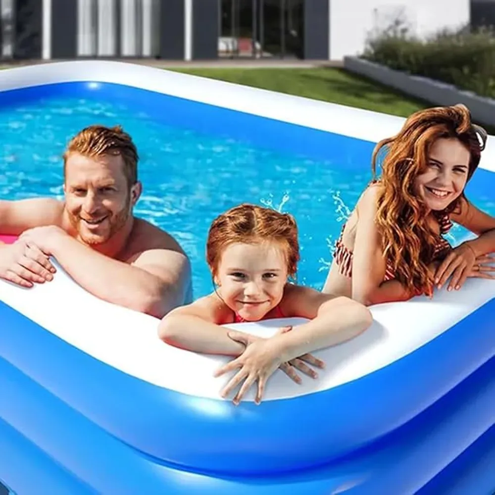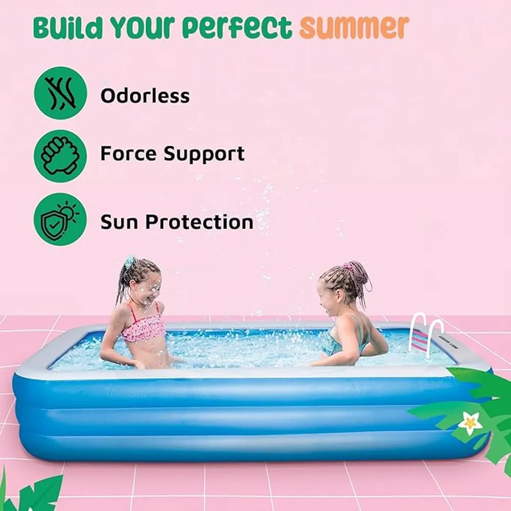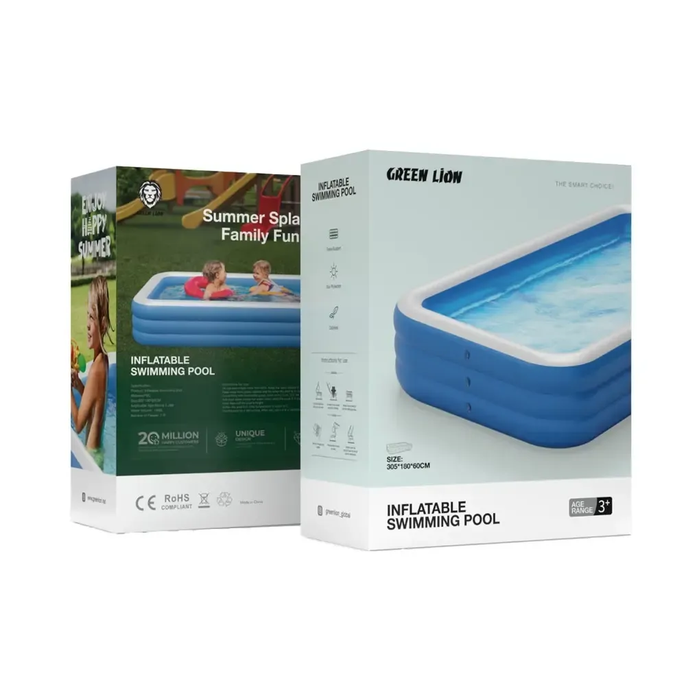 The Green Lion Inflatable Swimming Pool is the perfect summer essential for families and groups looking to stay cool and relaxed. Built with premium PVC material, it offers exceptional durability and resistance against sunlight and impact, ensuring long-lasting outdoor fun. Its large 1000L water capacity and spacious 305×180×60cm size make it ideal for 7–9 people, allowing everyone to enjoy the water together. With added sun protection, odorless design, and reinforced force support, this pool combines comfort, safety, and stability for an unbeatable backyard experience.