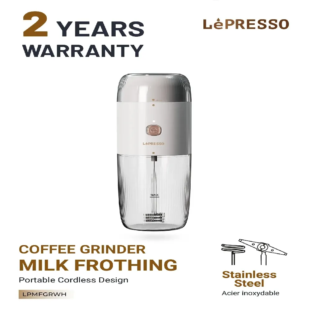 LePresso 2 in 1 Coffee Grinder and Milk Frother is the ultimate portable solution for coffee enthusiasts. This sleek, multi-functional device combines bean grinding and milk frothing in one compact tool, making it perfect for both home and travel. With a powerful 1500mAh rechargeable battery and high-speed stainless-steel blades, it delivers freshly ground coffee and creamy froth in minutes. Its Type-C charging port ensures fast recharging, while the durable design guarantees reliable performance anywhere.