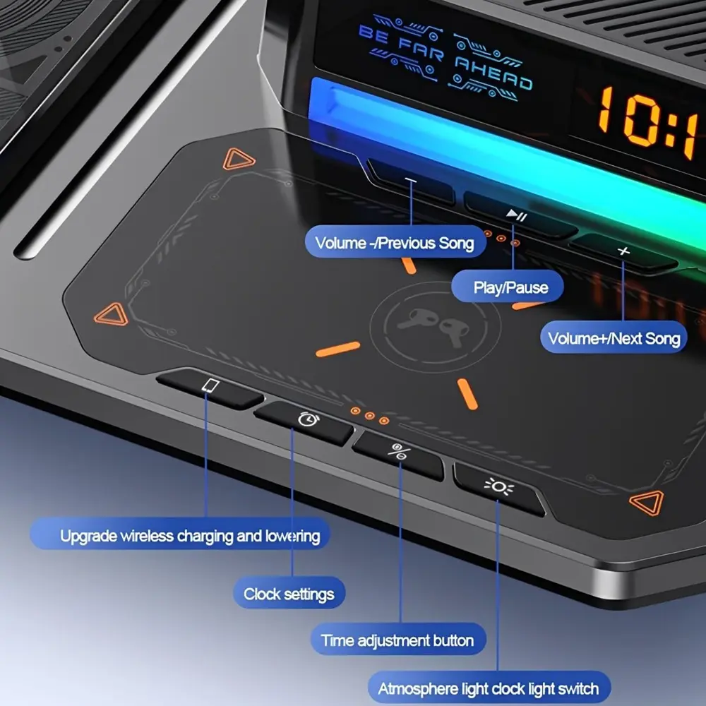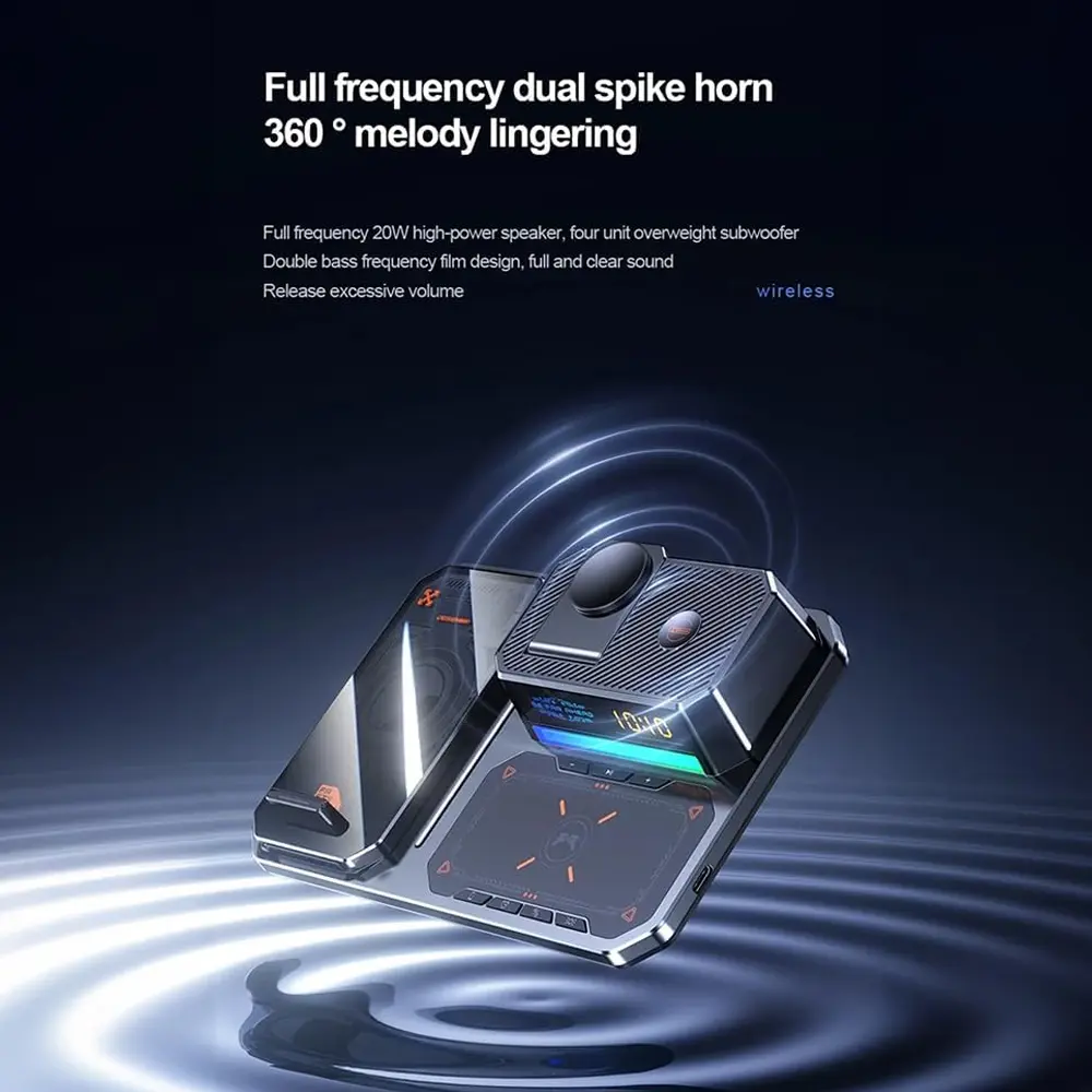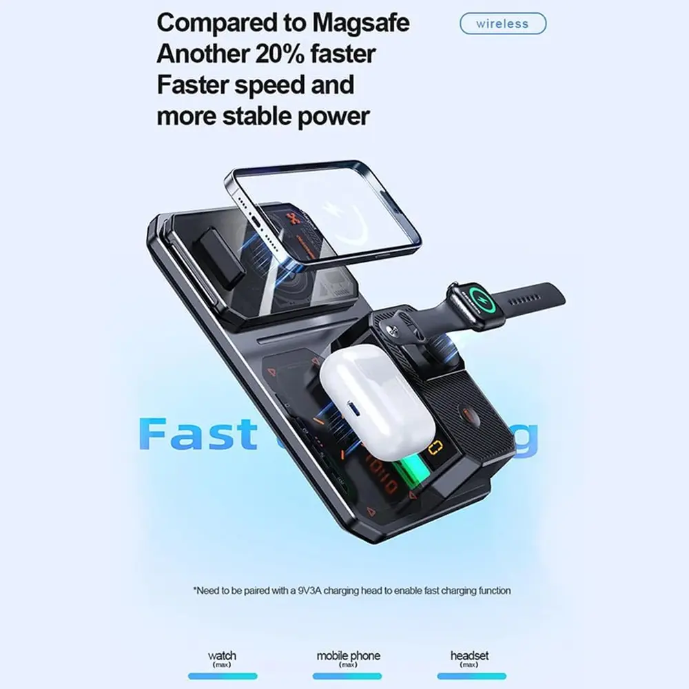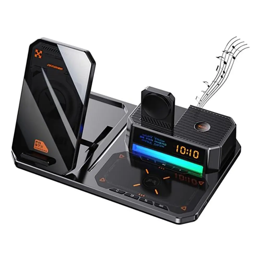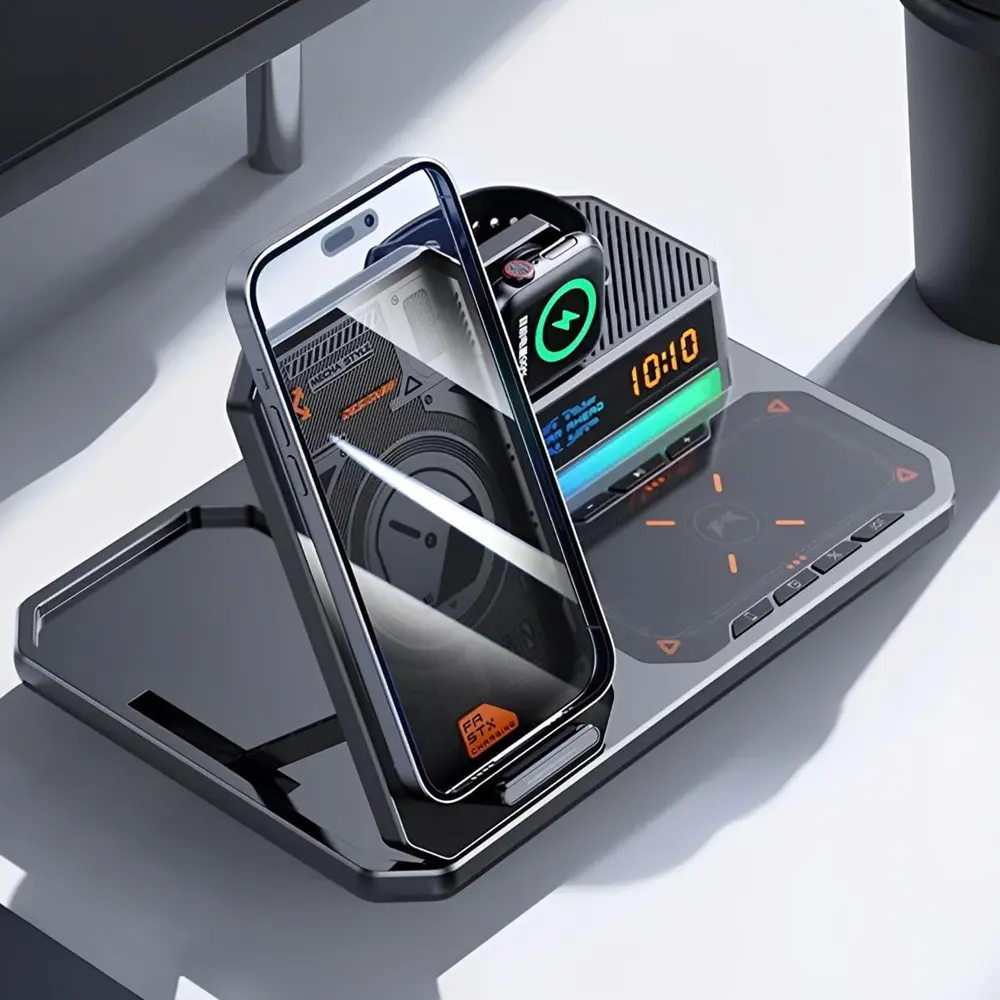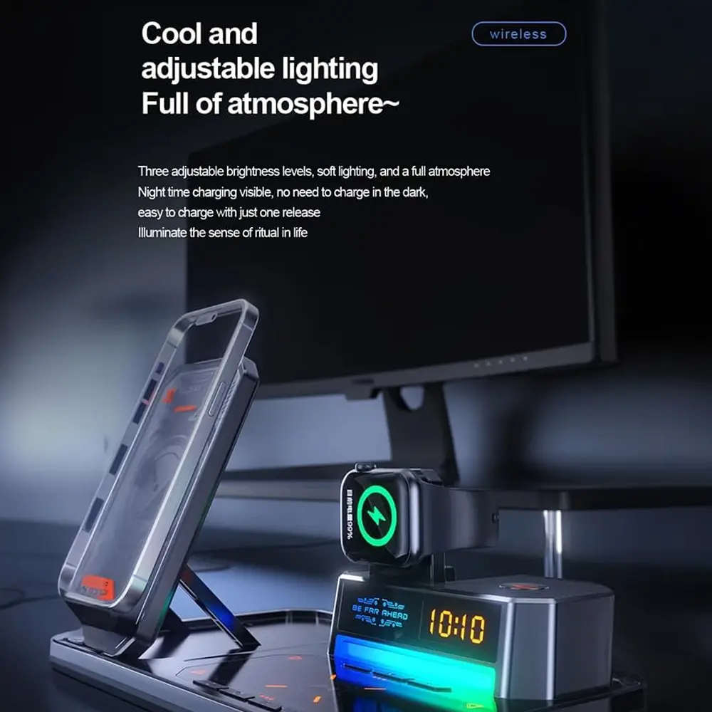 The T50 6-in-1 Magnetic Wireless Charging Station is a feature-rich desktop hub. It charges your phone, smartwatch, and earbuds simultaneously, while doubling as a Bluetooth 5.3 speaker and digital clock. Built with temperature-controlled cooling and a high-brightness display, it blends utility and style. Durable materials and a compact footprint make it the perfect all-in-one nightstand or workspace companion.