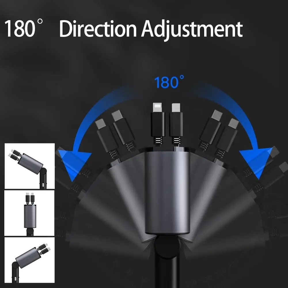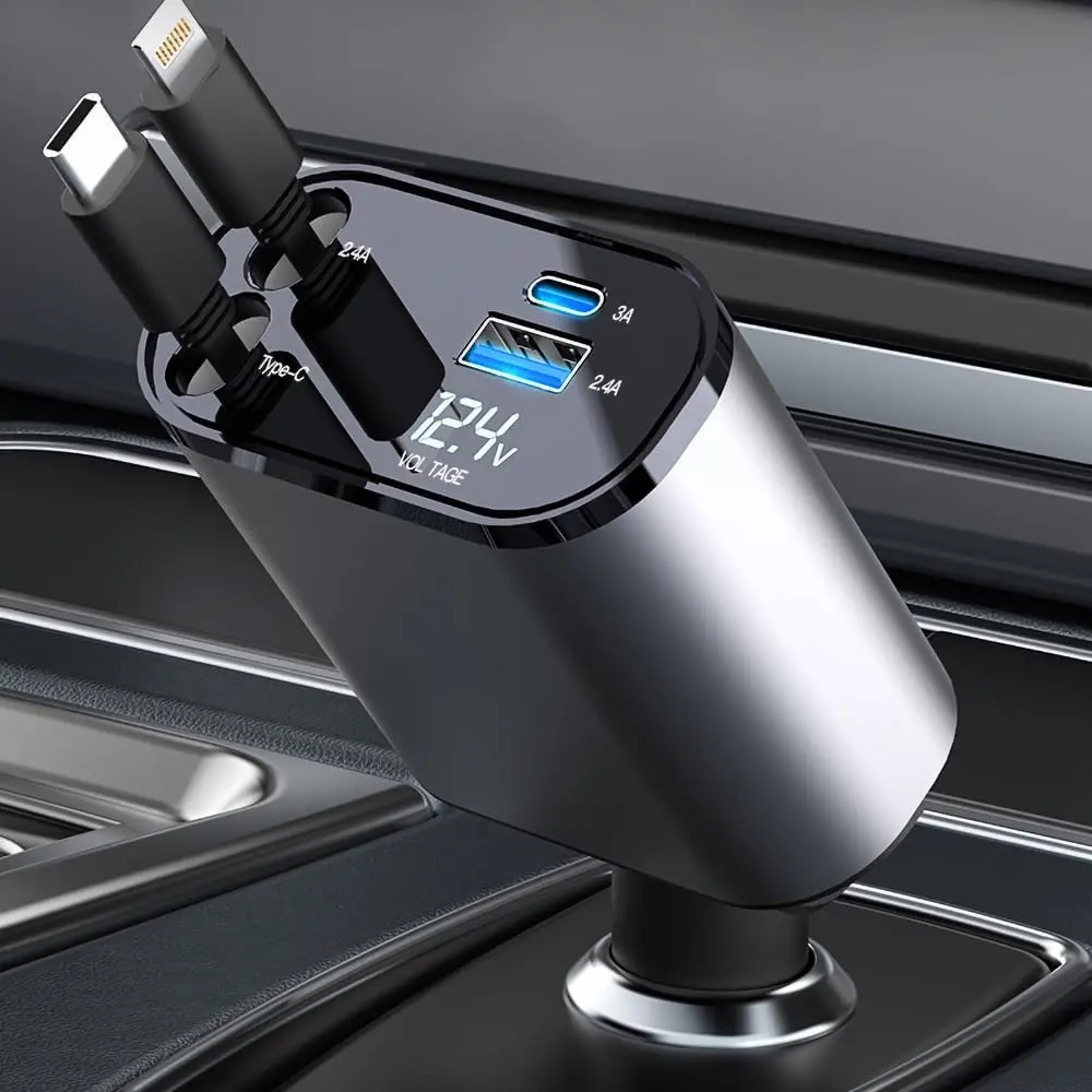 Stay powered on the go with this 4 in 1 Super-Fast Retractable Car Charger. Designed with convenience and speed in mind, it offers 120W of fast charging power and retractable cables to reduce clutter. The dual charging ports allow you to charge two devices simultaneously. A real-time voltage digital display helps monitor your car's battery health. With adjustable plug angles and certified fast-charging protocols, it's perfect for any vehicle. Compact, efficient, and easy to use, it's a must-have for road trips and daily drives.