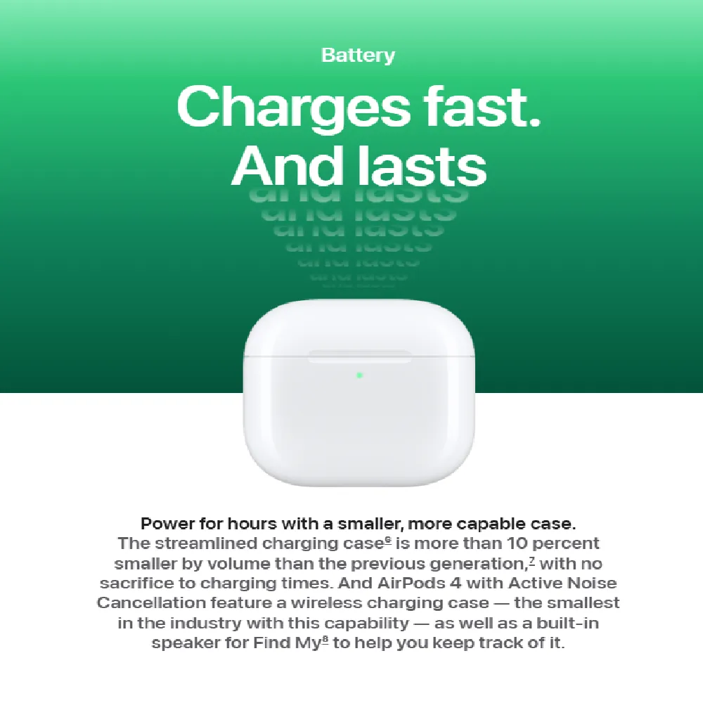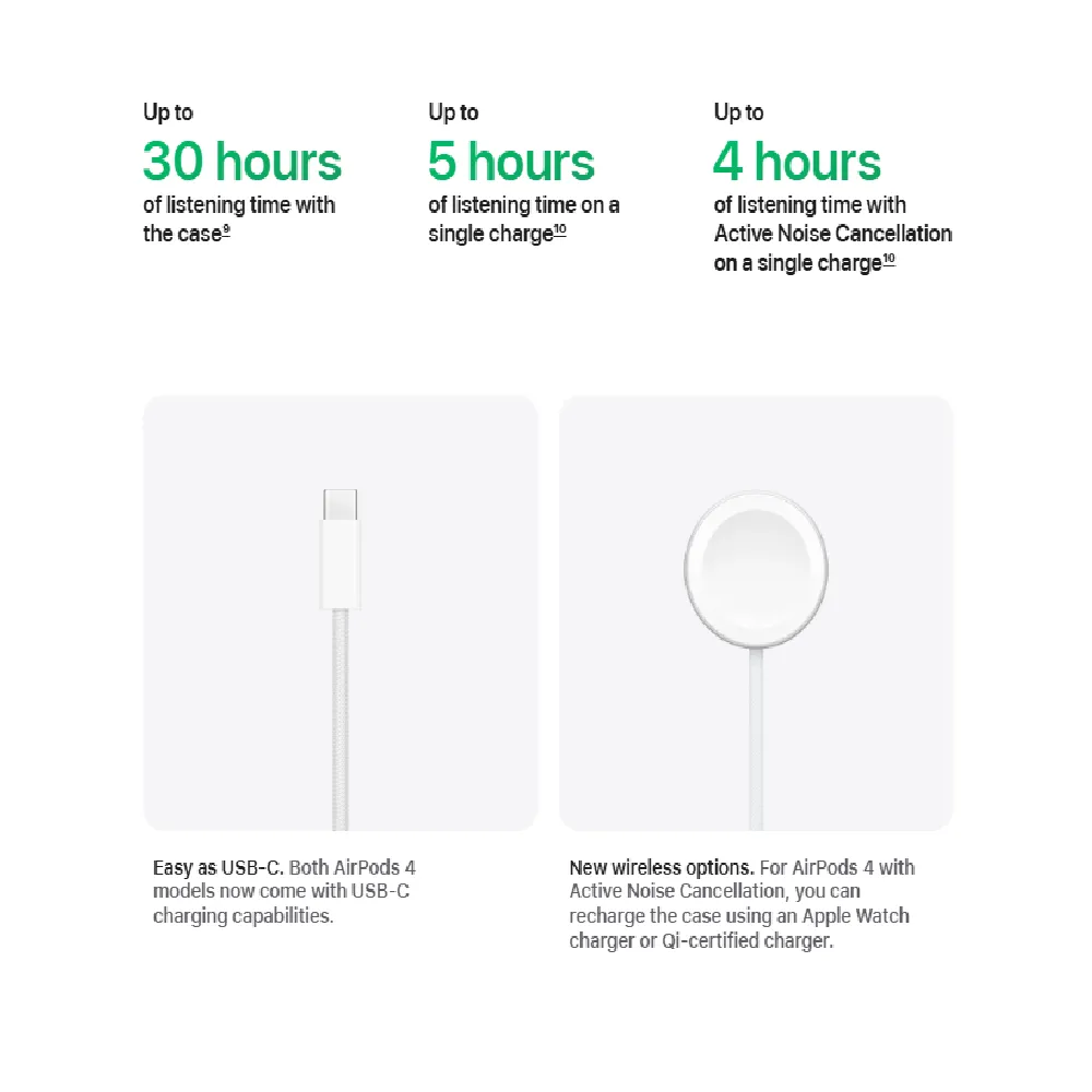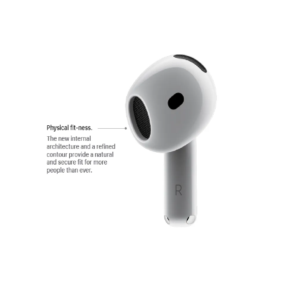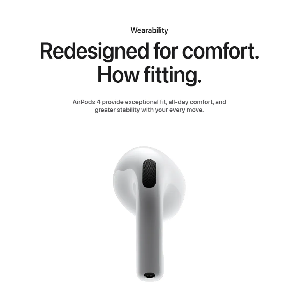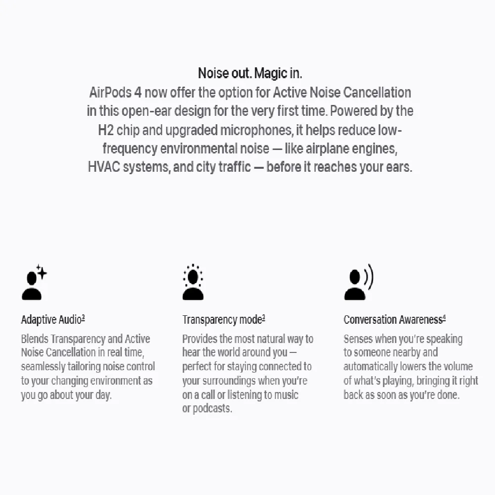 Experience next-level wireless audio with the Apple AirPods 4, designed for seamless integration with your Apple ecosystem. Featuring Spatial Audio with dynamic head tracking, these earbuds offer an immersive, theater-like sound experience. Equipped with the advanced H2 chip, they deliver intelligent noise control, improved connectivity, and superior audio quality. Lightweight and compact, AirPods 4 are perfect for daily use—whether you're commuting, working out, or making calls—with all-day battery life and water resistance to match.