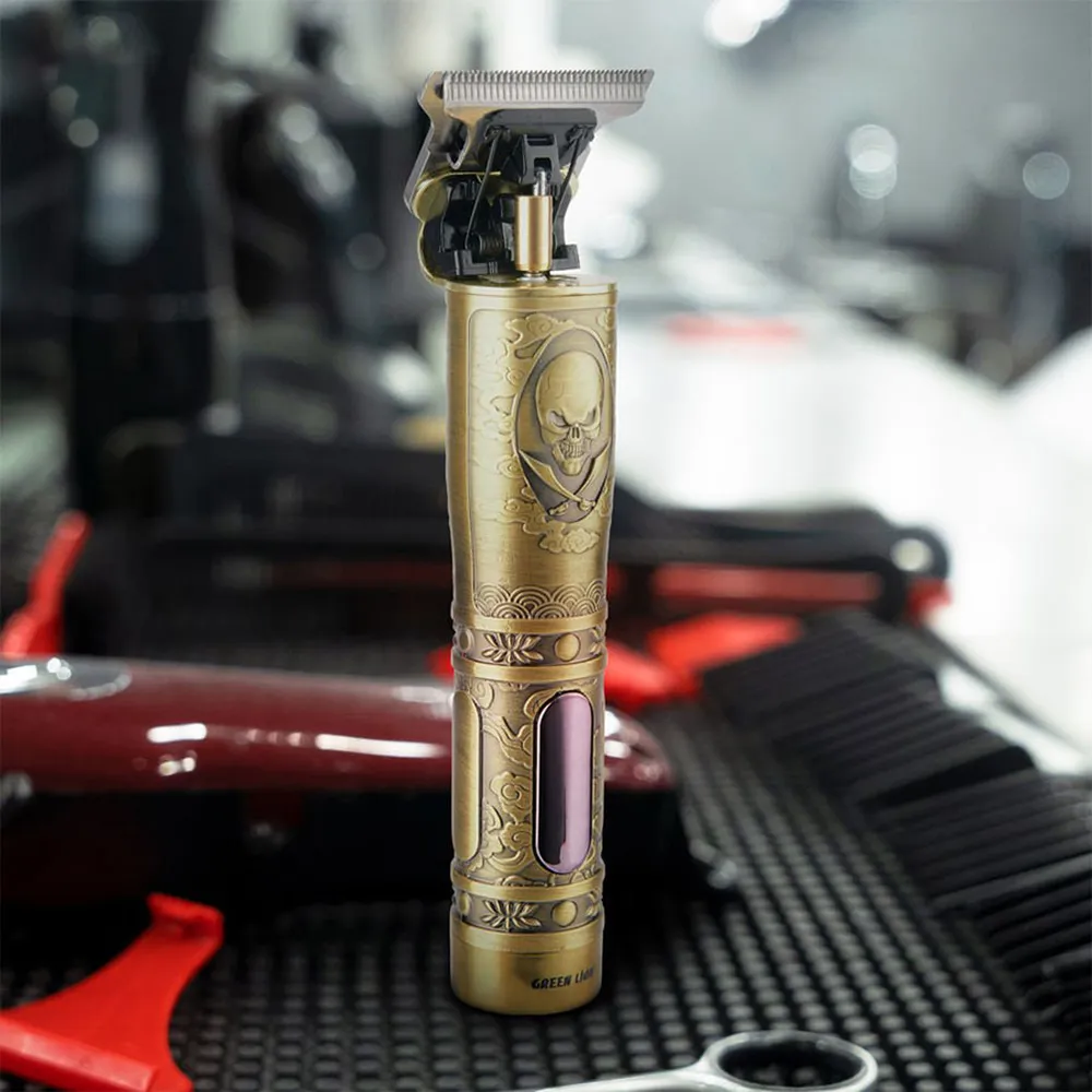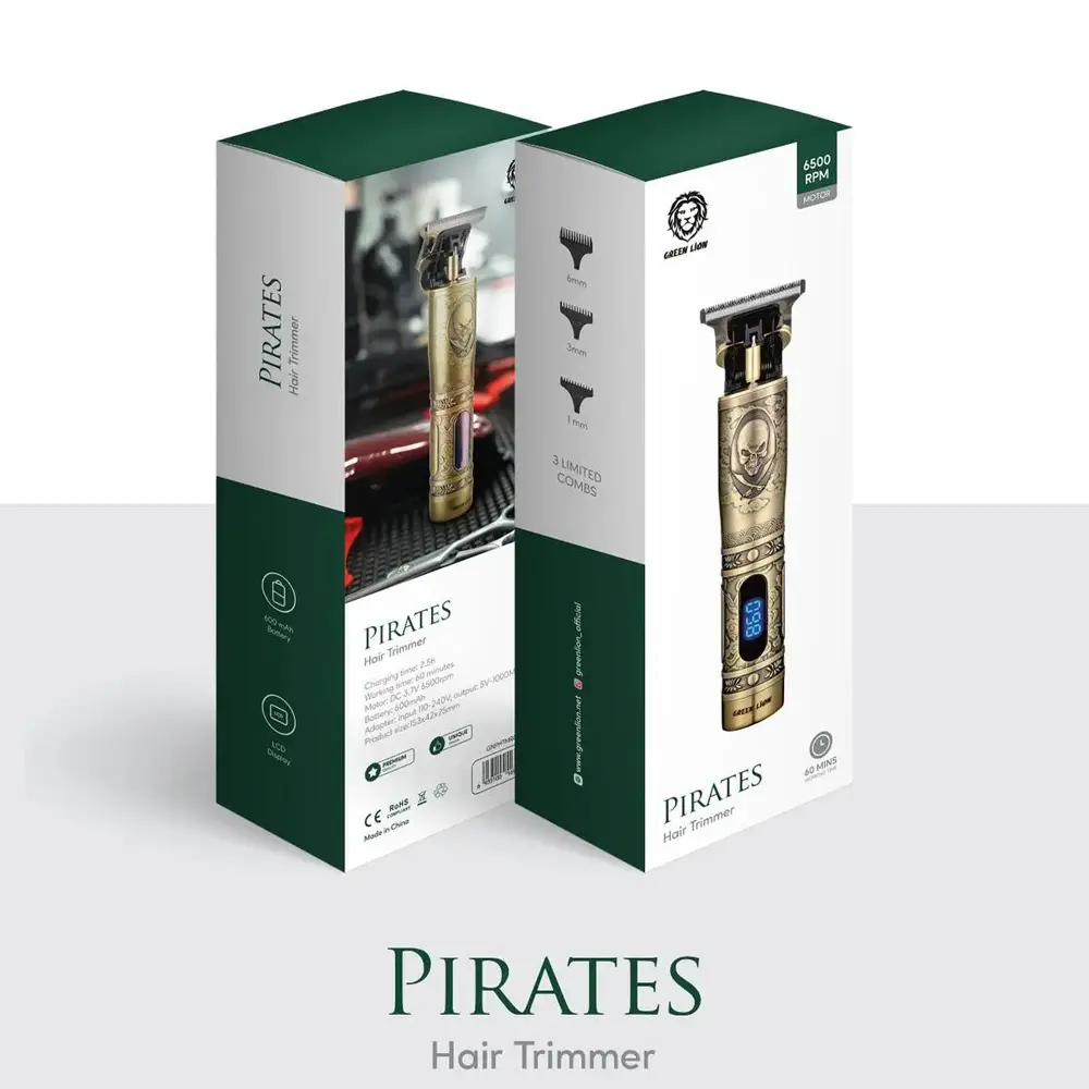 Unleash your grooming game with the Green Lion Pirates Hair Trimmer — a perfect blend of edgy design and reliable performance. Built with a rugged gold metal body and a fierce skull motif, this trimmer is made for those who dare to stand out. It features a powerful 6500RPM motor for smooth and efficient trims, and an LCD display to track usage in real-time. With fast Type-C charging and up to 60 minutes of cordless use, this trimmer delivers style, power, and precision in one adventurous package.