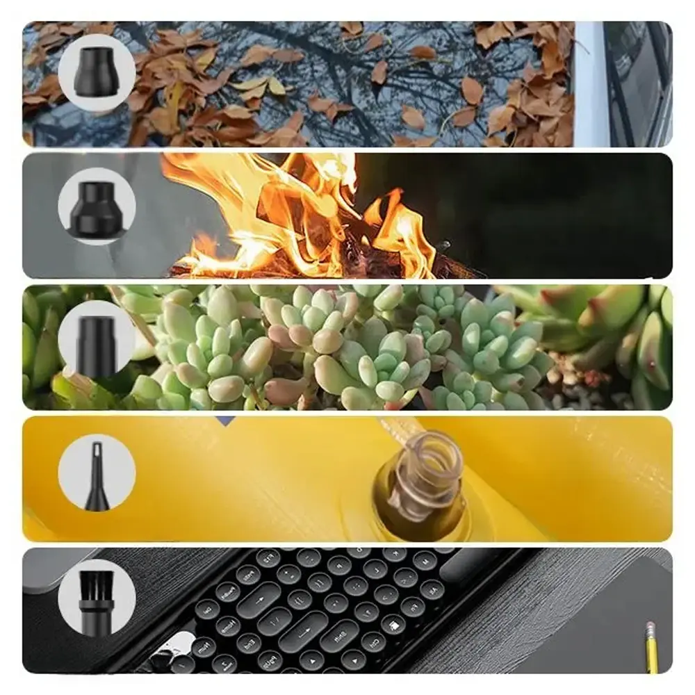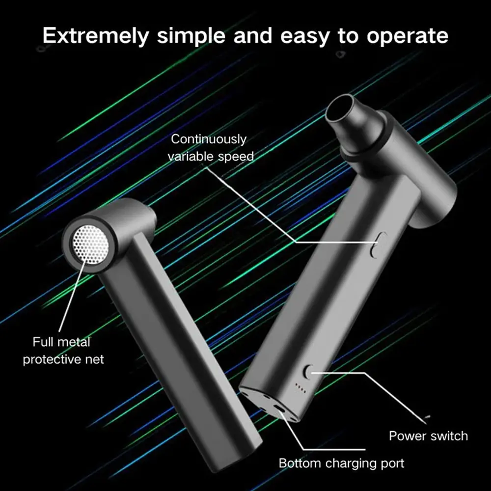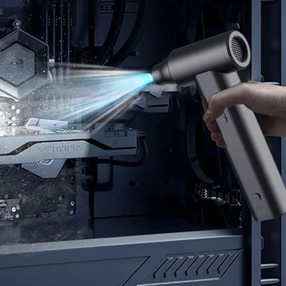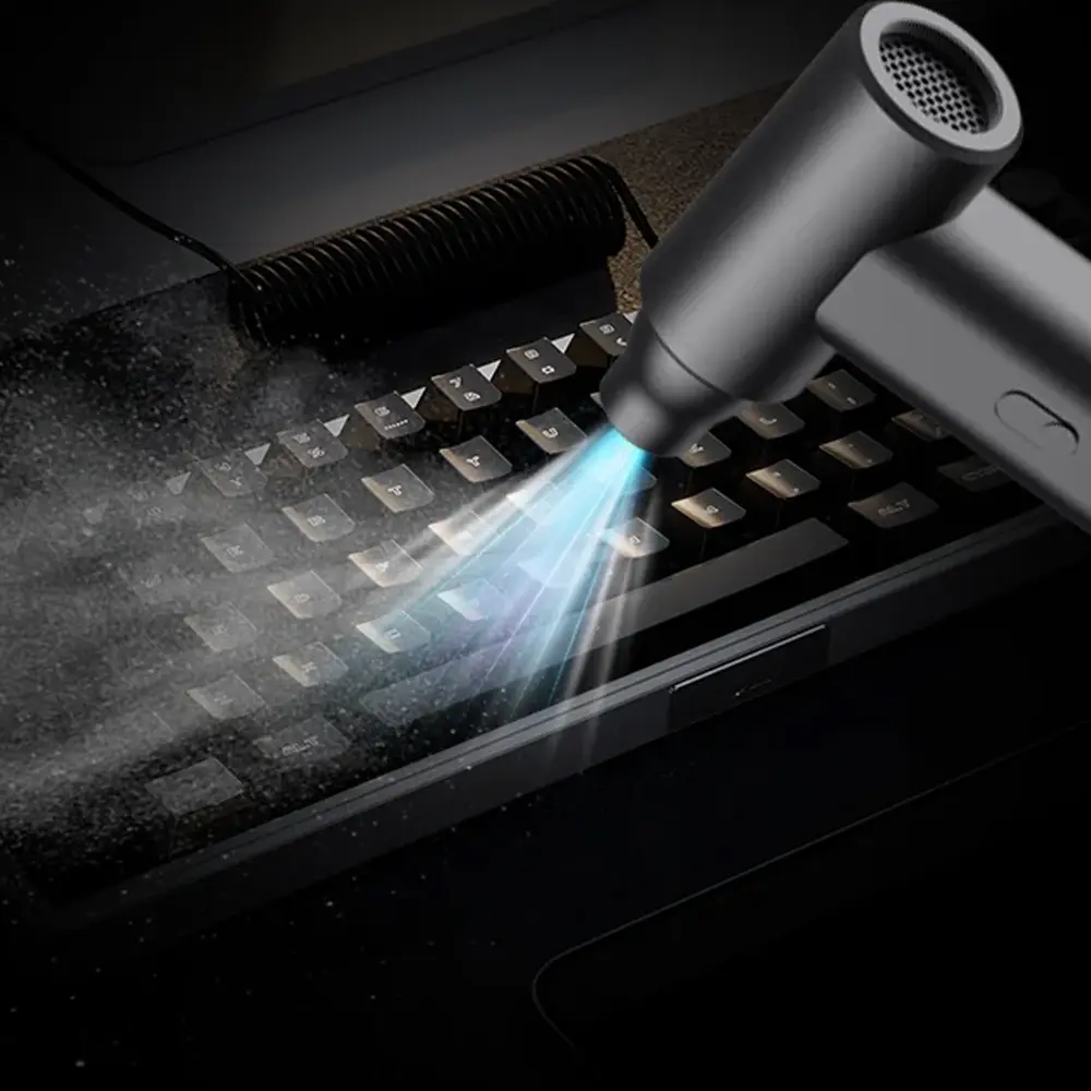 A high-power, handheld cleaning tool designed for efficiency and ease of use. Equipped with a super brushless motor, it delivers strong and consistent airflow, perfect for removing dust from keyboards, laptops, car interiors, and other tight spaces. Its compact, lightweight design makes it easy to carry and operate, whether at home, in the office, or on the go. Built-in over-temperature protection ensures safe operation during extended use, while the rechargeable battery provides long-lasting performance. With Type-C charging, powering up is fast and convenient. This dust blower is a smart, eco-friendly alternative to disposable air cans, offering powerful cleaning anytime, anywhere.