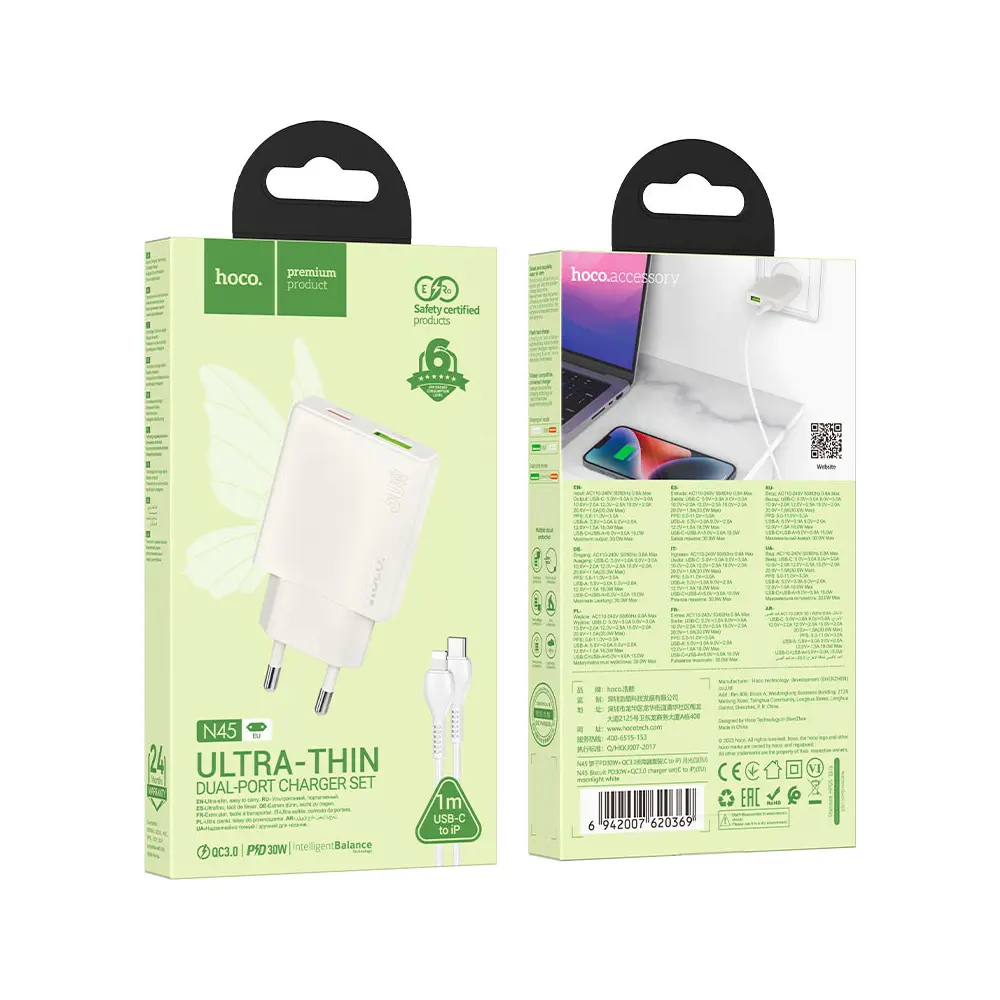 Hoco N45 dual port wall charger set is a versatile and powerful charging solution designed to meet the needs of modern devices. With its high-speed charging capabilities, compact design, and durable construction, this charger set is perfect for those who need a reliable and efficient way to charge their gadgets.