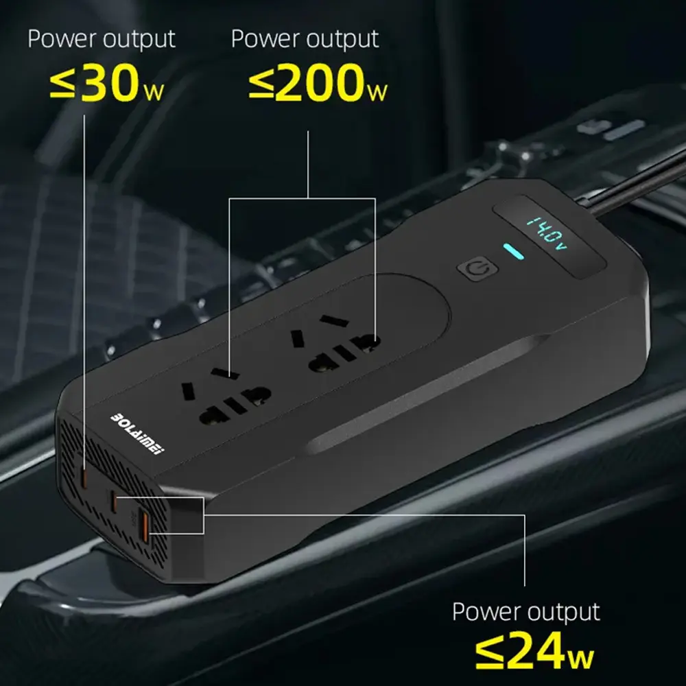 A Multifunctional In-car Power Supply Station with 200W high power, AC dual port output, Support fast charging mobile devices Universal for 12V car models.