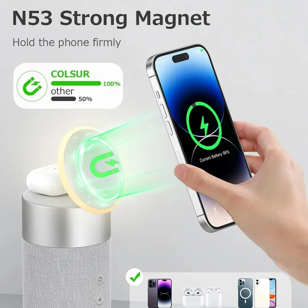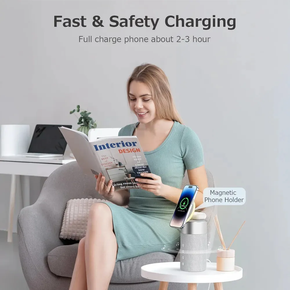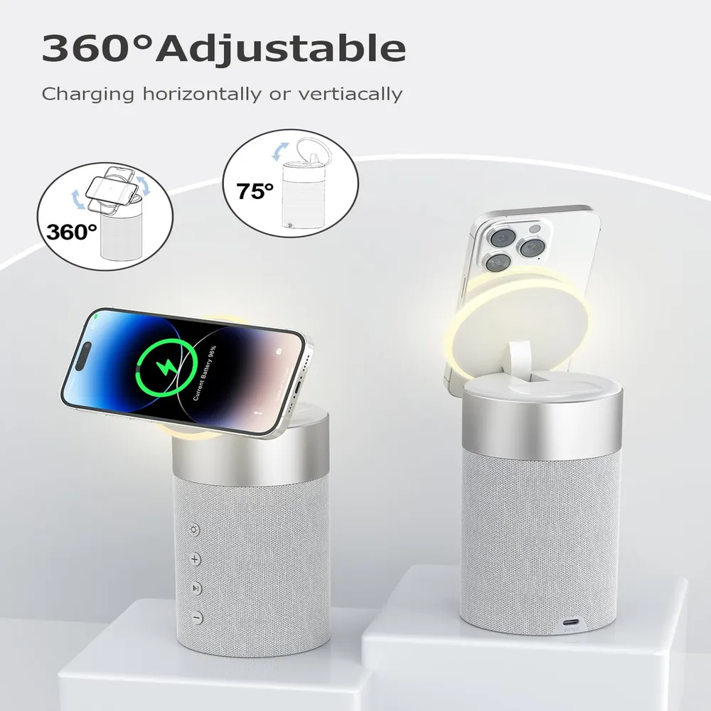 Experience the perfect blend of charging convenience, immersive sound, and ambient lighting with this 2-in-1 Magnetic Wireless Charger and Bluetooth Speaker. Designed for modern lifestyles, it powers your iPhone and AirPods simultaneously while doubling as a MagSafe-compatible phone stand. The built-in Bluetooth 5.1 speaker delivers crisp stereo sound, and the LED night light creates a cozy atmosphere wherever you go. Compact, stylish, and multi-functional, it’s ideal for your bedside table, office desk, or travel setup.