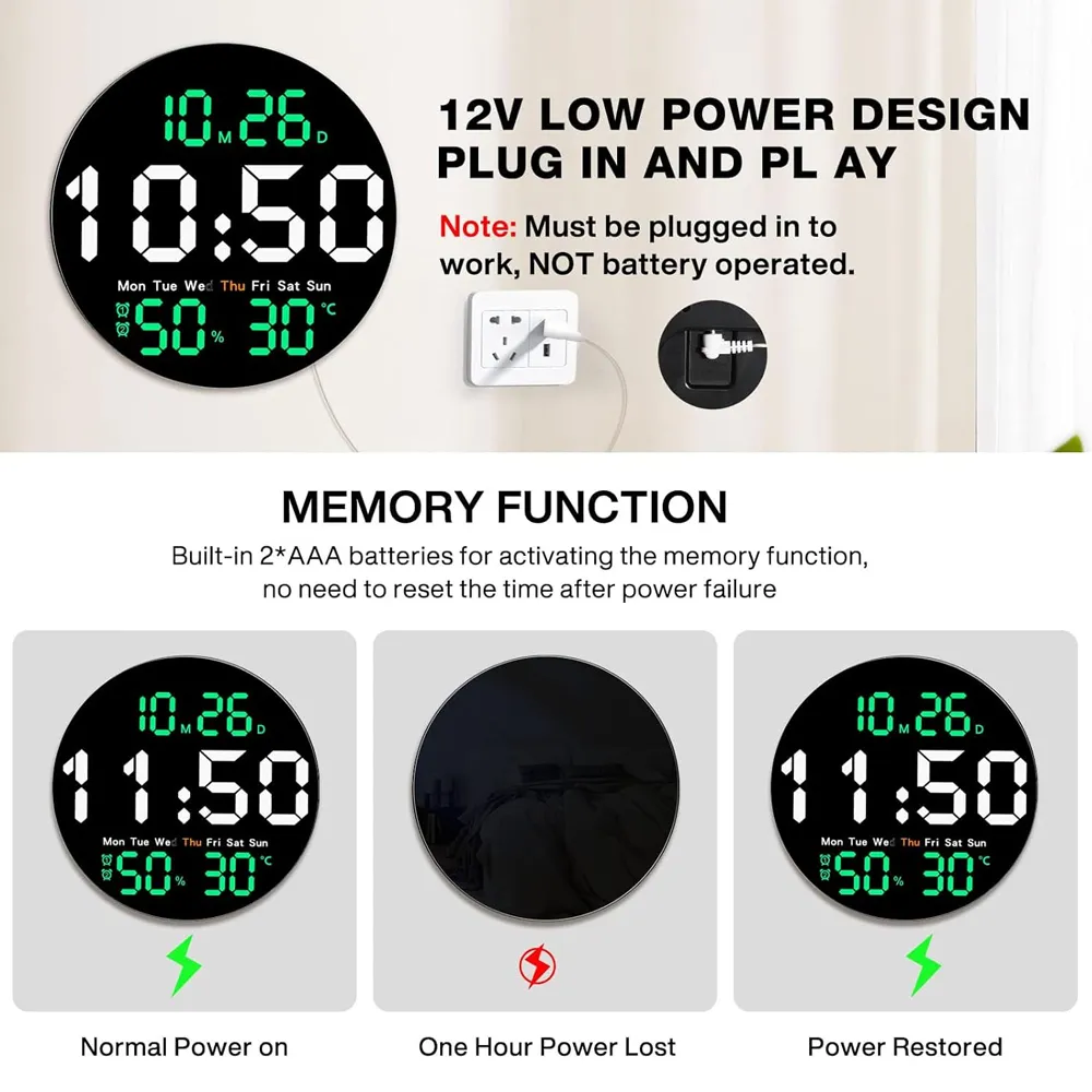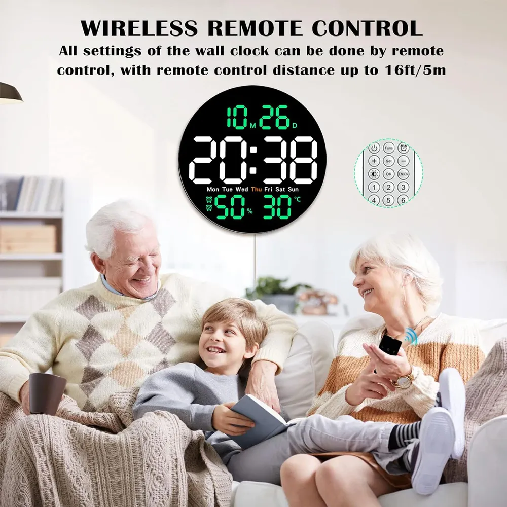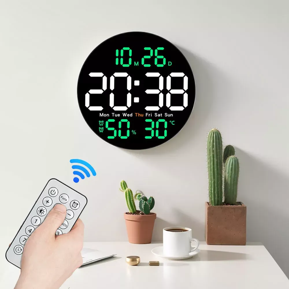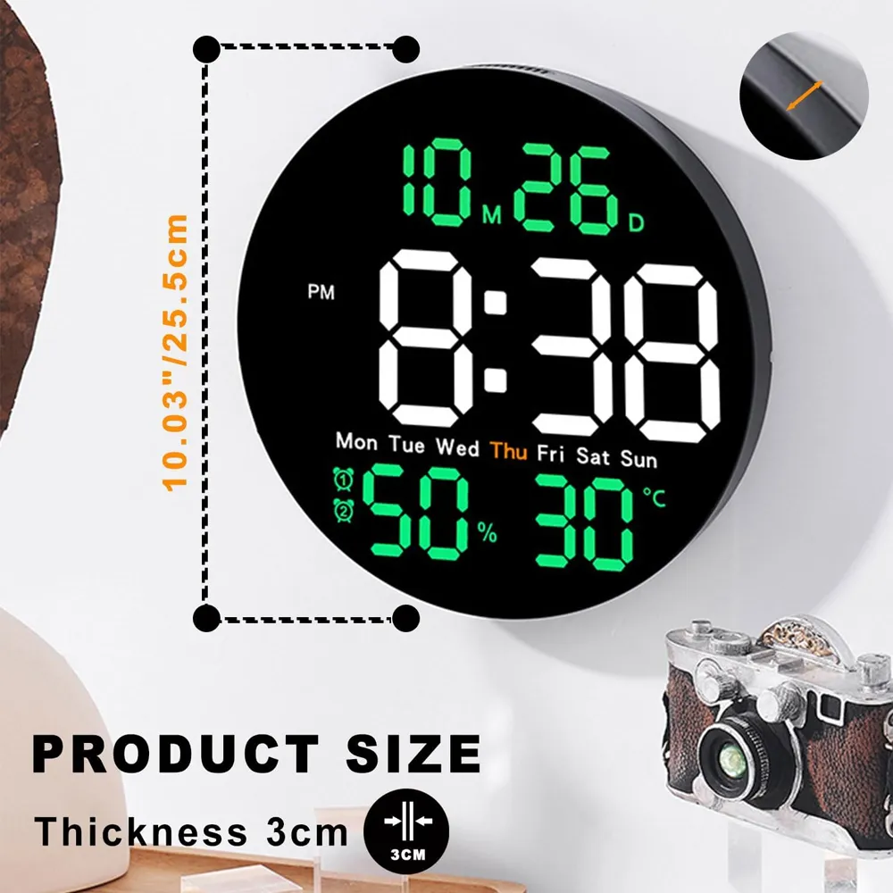 This LED Digital Wall Clock features a large 10-inch display, making it easy to read from anywhere in the room. It combines modern technology with practical features like automatic brightness adjustment, temperature, humidity, date, and day display. The clock is powered via USB, ensuring easy and stable power supply, with a built-in memory function to keep your settings even during power interruptions. The included remote control allows you to adjust brightness and alarms without getting up. Its dual alarm and timer functions make it perfect for living rooms, kitchens, or offices.