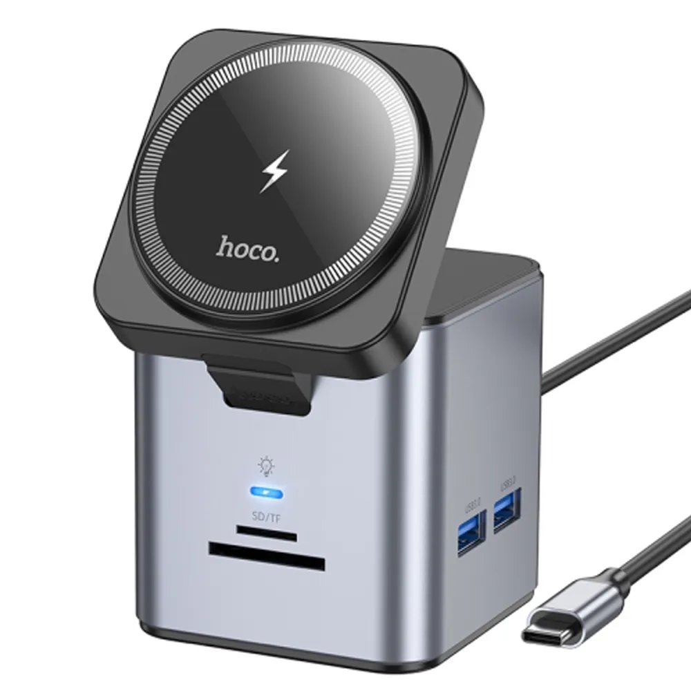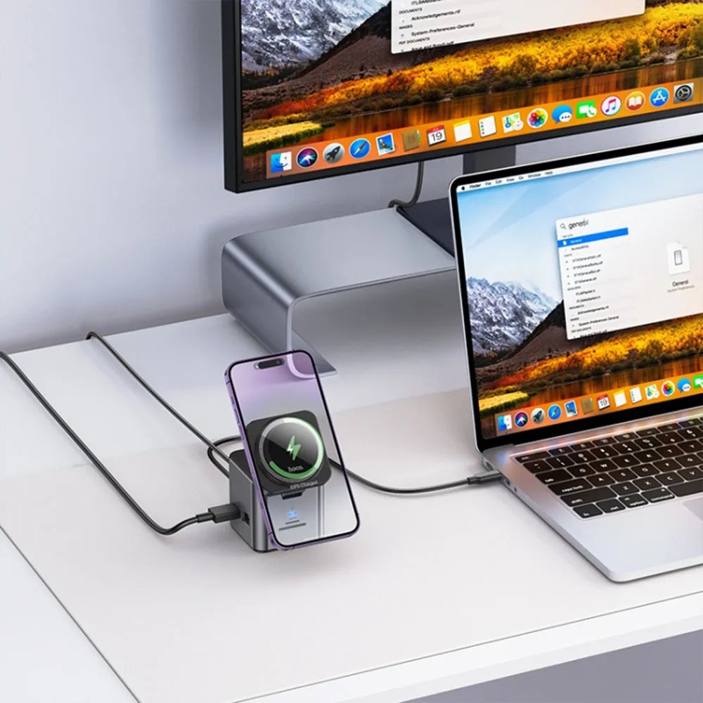 The HOCO HB49 9-in-1 Magnetic Wireless Fast Charging Station offers a seamless solution for managing your devices and connectivity needs in one compact design. With its sleek metal gray finish, this station integrates multiple functions, allowing effortless connections for your work or home setup.
