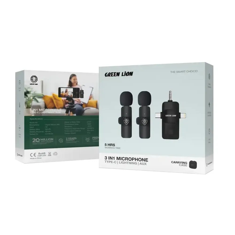 The Green Lion 3-in-1 Microphone is designed for creators who need flexibility, clarity, and reliability in one compact device. With triple connectivity options—Type-C, Lightning, and AUX—it offers seamless compatibility with smartphones, tablets, and audio equipment. Featuring a professional-grade silicone mic, it captures crisp and clean sound with minimal background noise, making it ideal for content creation, live performances, or virtual meetings. Its impressive 20-meter transmission range and 5-hour battery life ensure uninterrupted audio, even on the go.