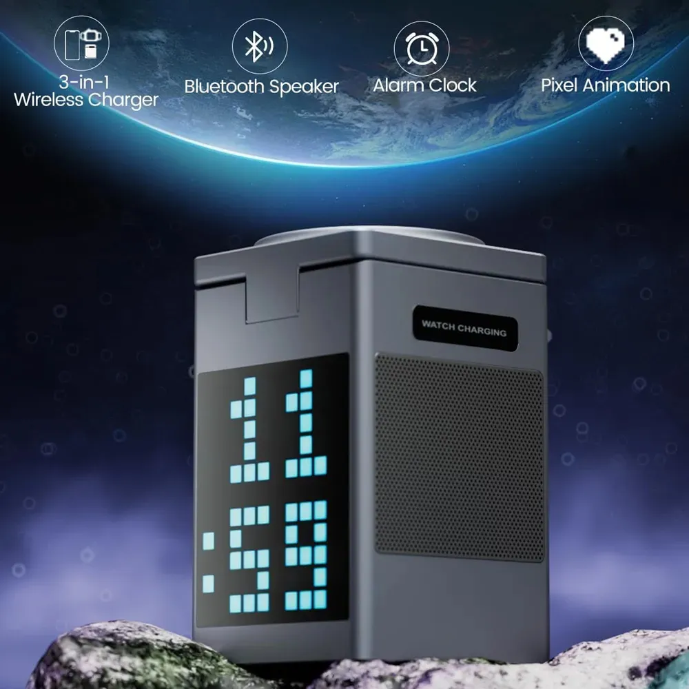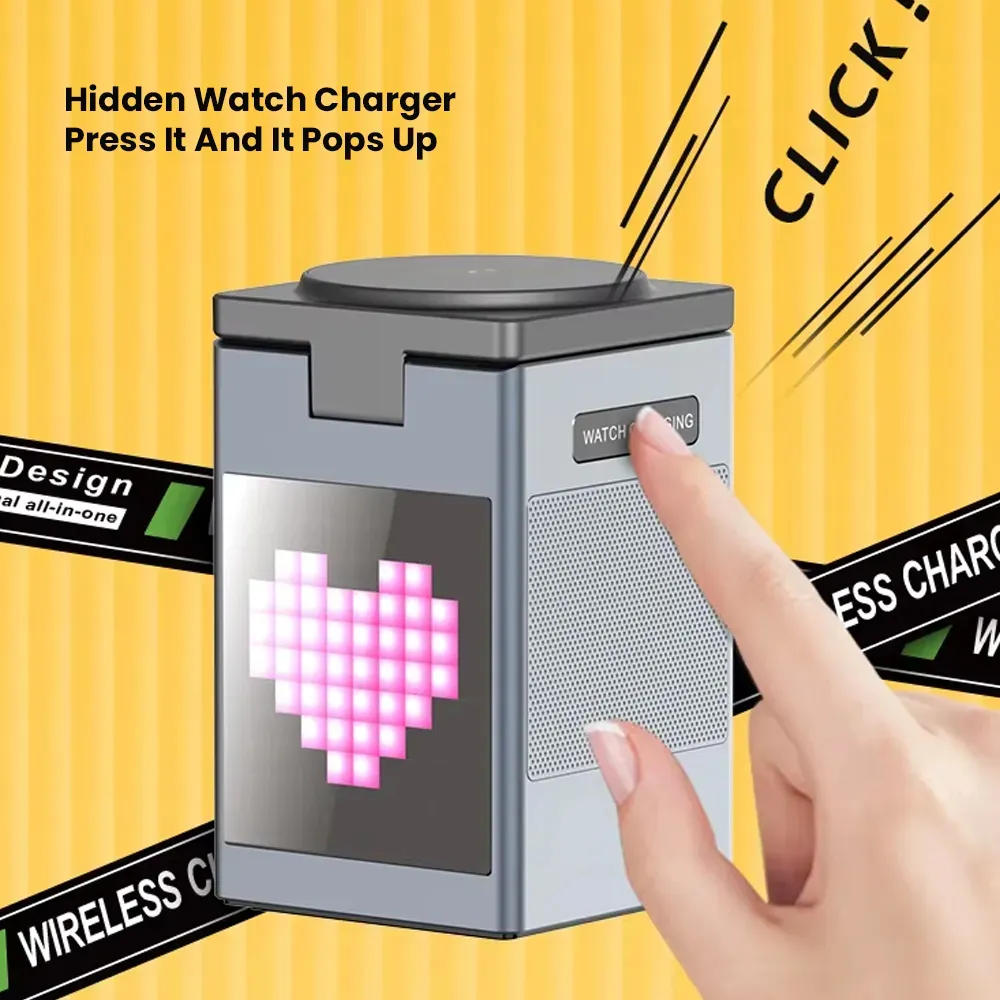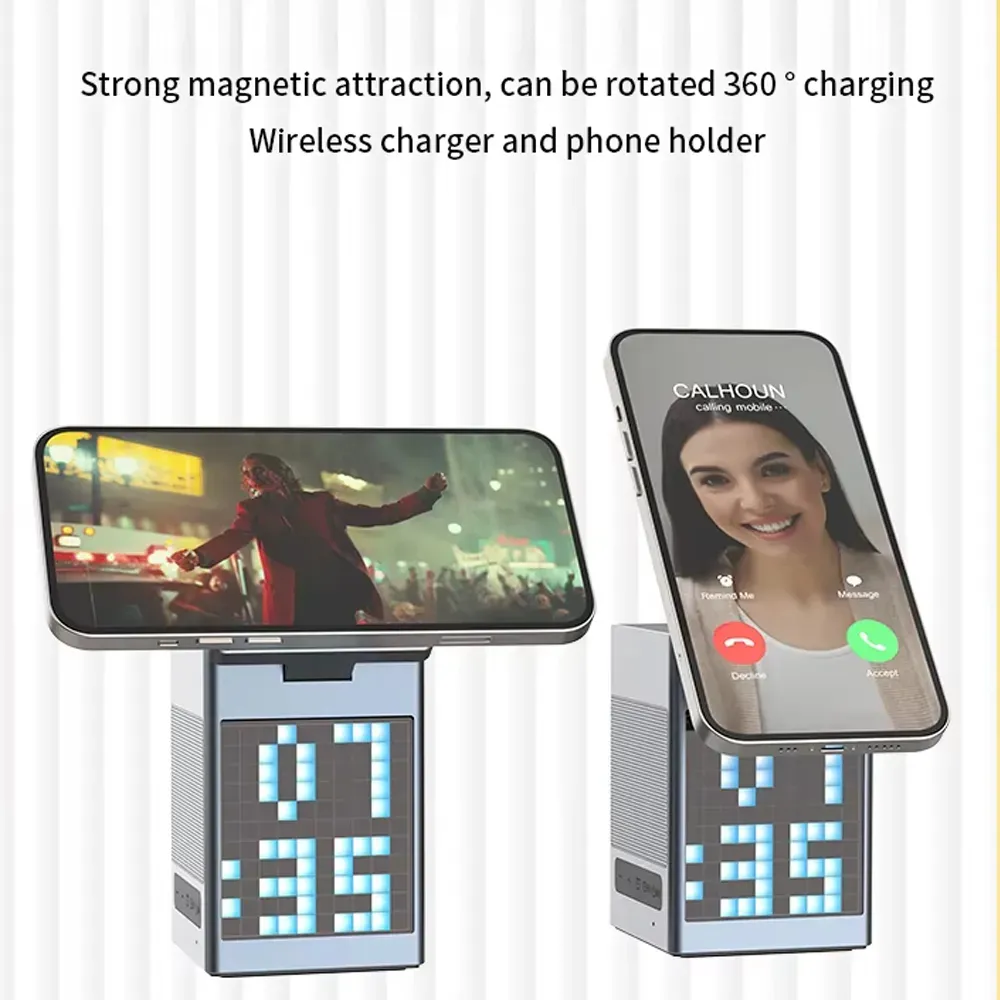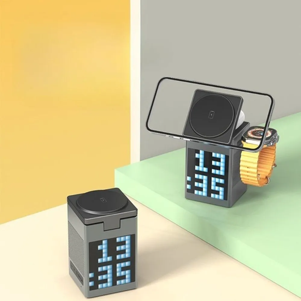 The Pixel Bluetooth Speaker with Wireless Charger is a compact and stylish 3-in-1 device that enhances both your sound experience and desktop organization. It features a dynamic pixel RGB display, high-quality Bluetooth 5.3 audio, and a 15W fast wireless charging pad compatible with phones, earbuds, and smartwatches. With added clock and alarm functions, this is the perfect multi-functional accessory for your bedroom, office, or travel kit. Foldable and portable, it’s as convenient as it is innovative.