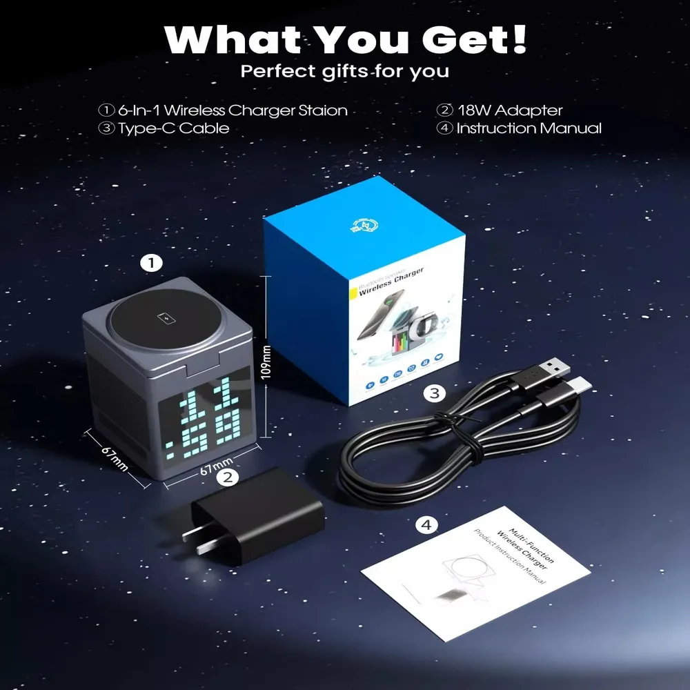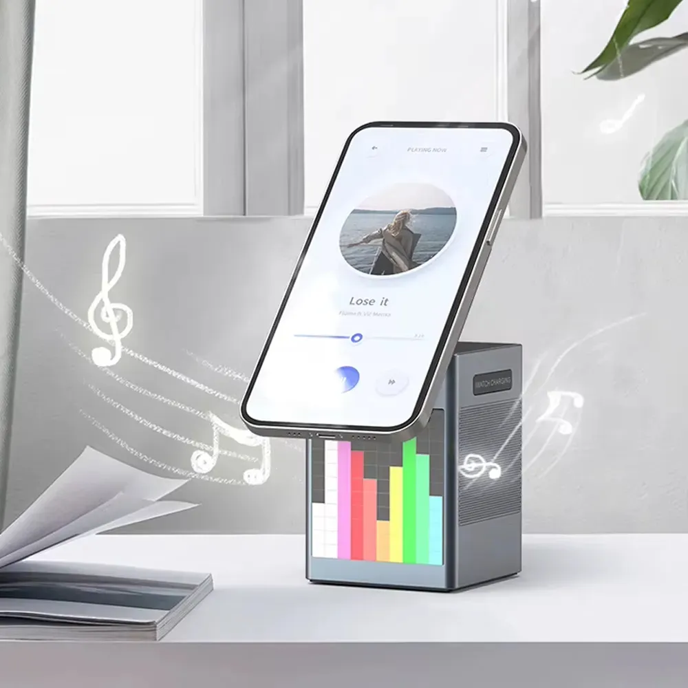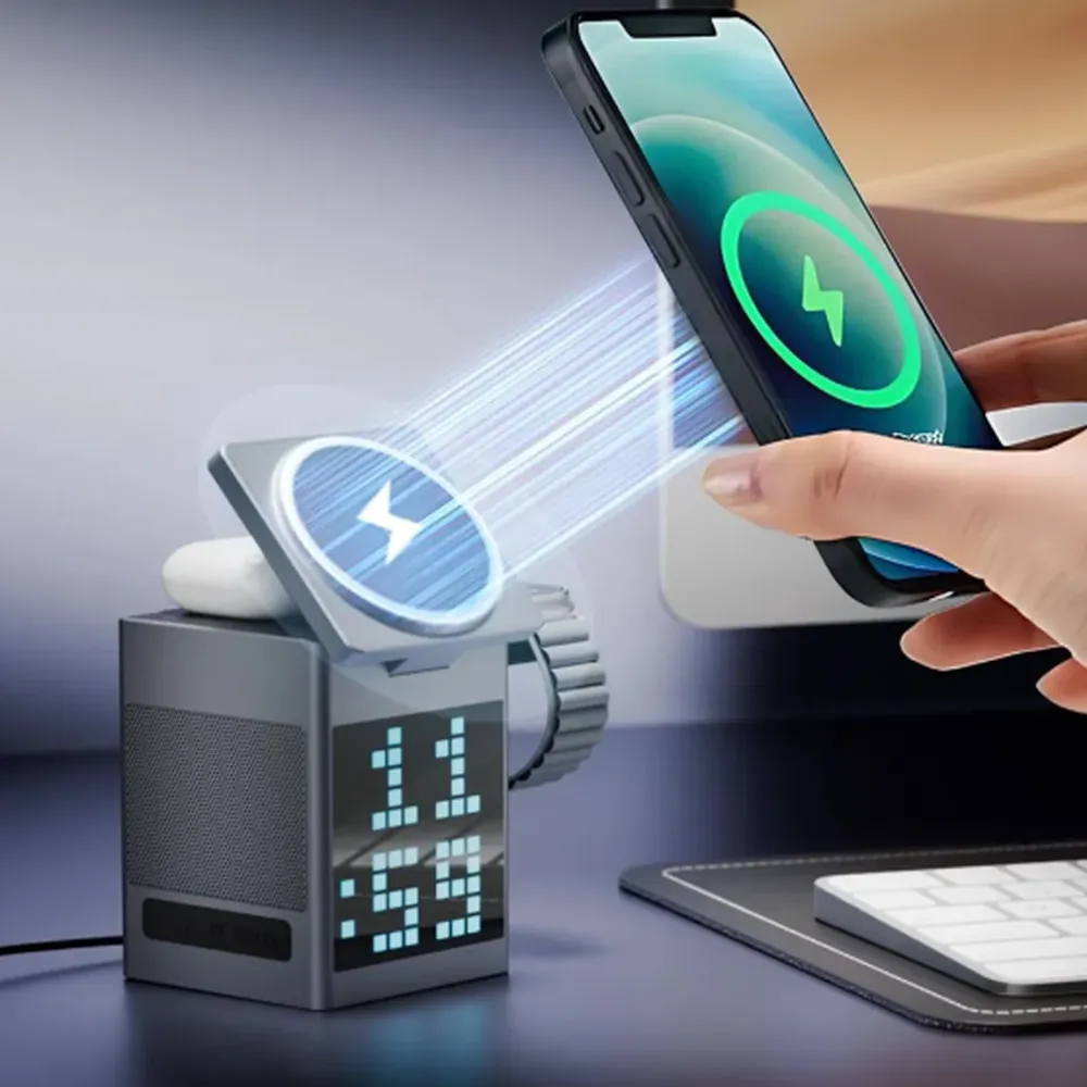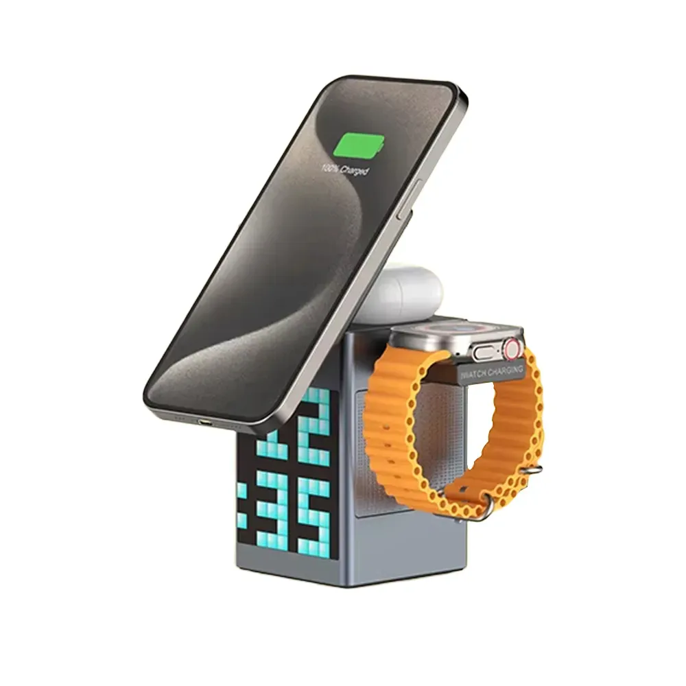 The Pixel Bluetooth Speaker with Wireless Charger is a compact and stylish 3-in-1 device that enhances both your sound experience and desktop organization. It features a dynamic pixel RGB display, high-quality Bluetooth 5.3 audio, and a 15W fast wireless charging pad compatible with phones, earbuds, and smartwatches. With added clock and alarm functions, this is the perfect multi-functional accessory for your bedroom, office, or travel kit. Foldable and portable, it’s as convenient as it is innovative.