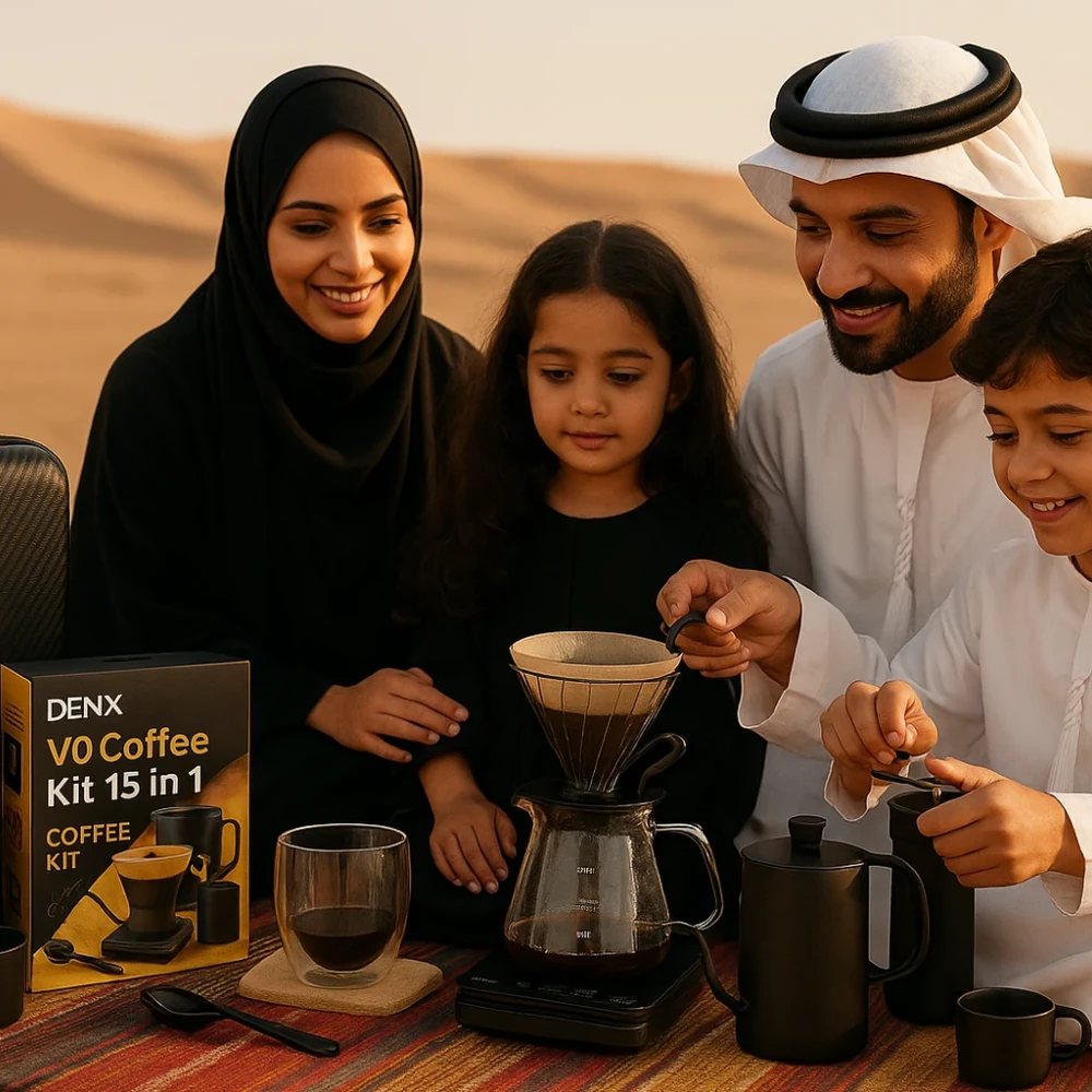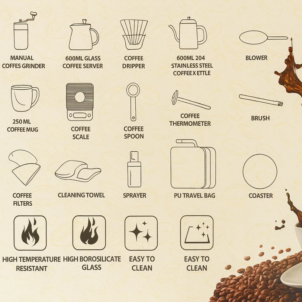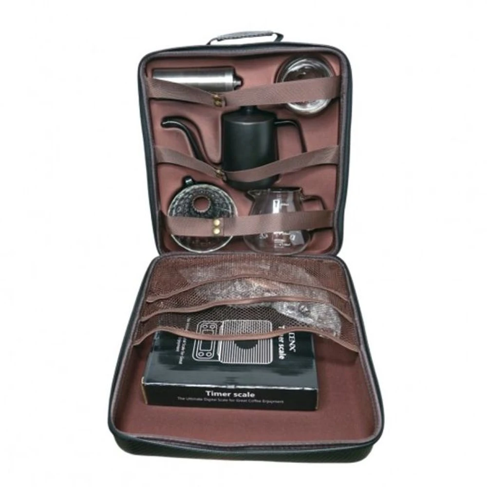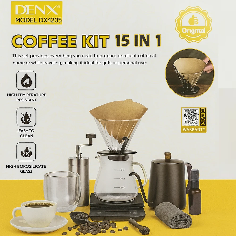 Enjoy café-quality coffee anywhere with the DENX V60 Coffee Kit DX2573, a complete 15-piece brewing bundle designed for travelers, campers, and coffee lovers who want professional results on the go. This all-in-one kit includes everything from a precision stainless steel kettle to a manual grinder, glass server, thermometer, scale, and more—packed neatly in a durable PU travel bag. Built with high-quality materials like borosilicate glass, 304 stainless steel, and premium plastics, it ensures reliable performance and long-lasting use. Whether at home, office, or outdoors, this kit provides a perfect V60 experience anytime.