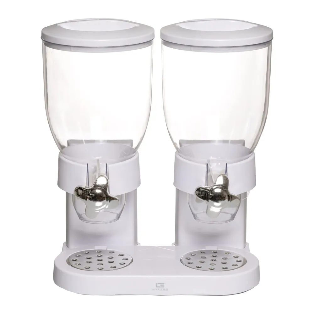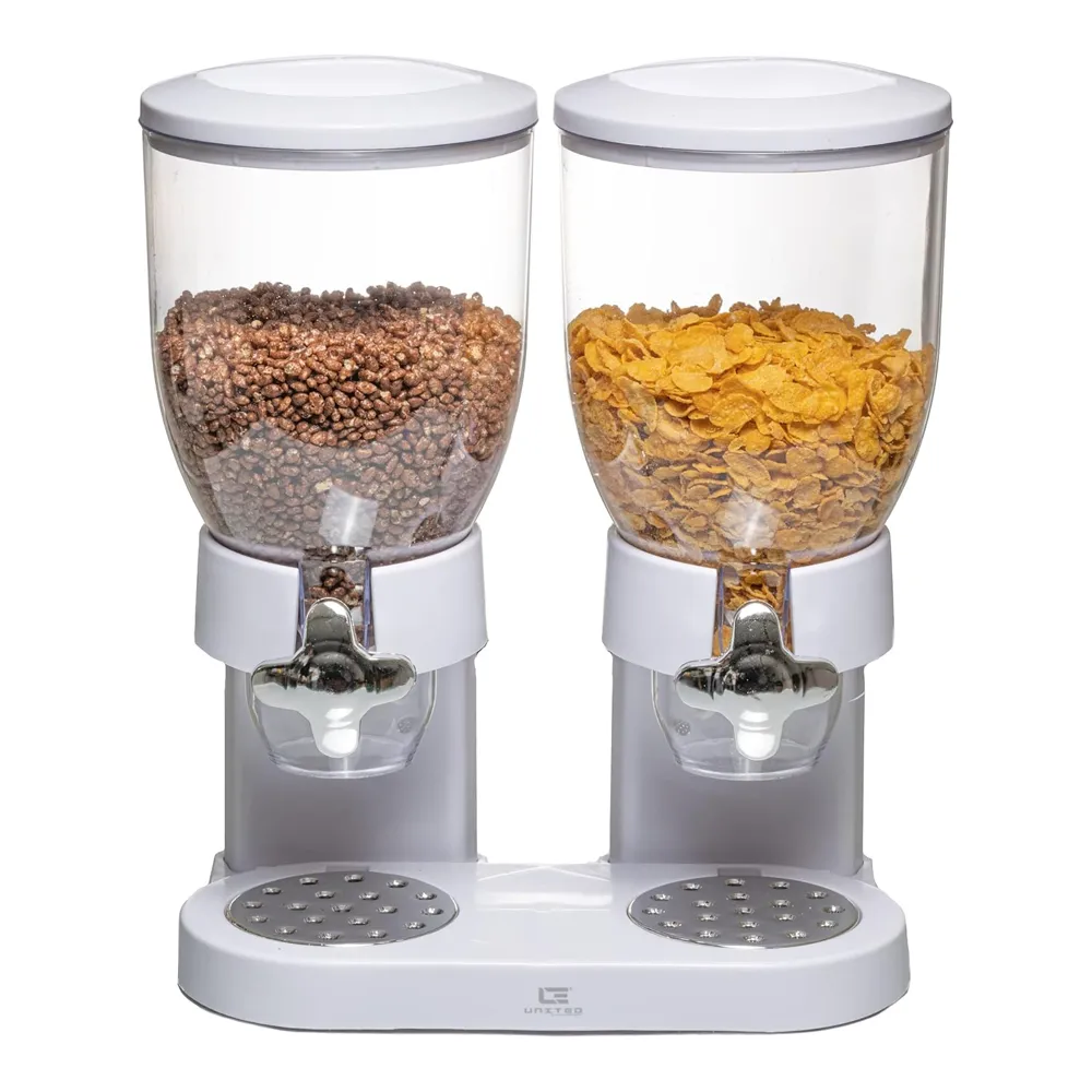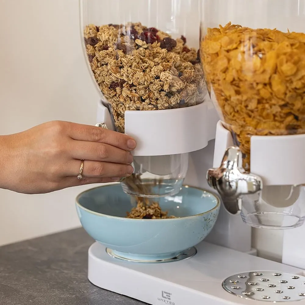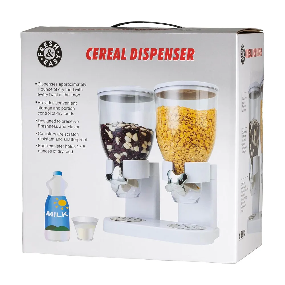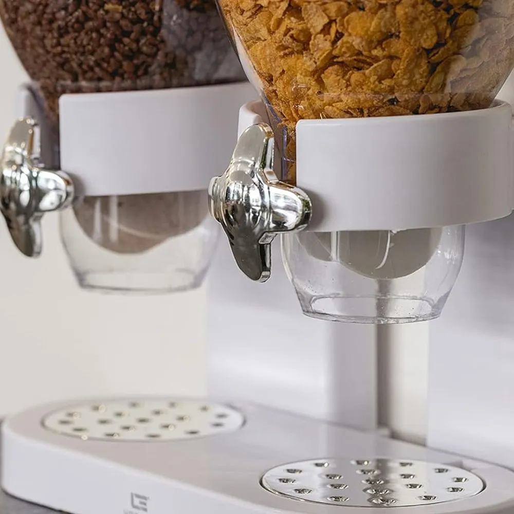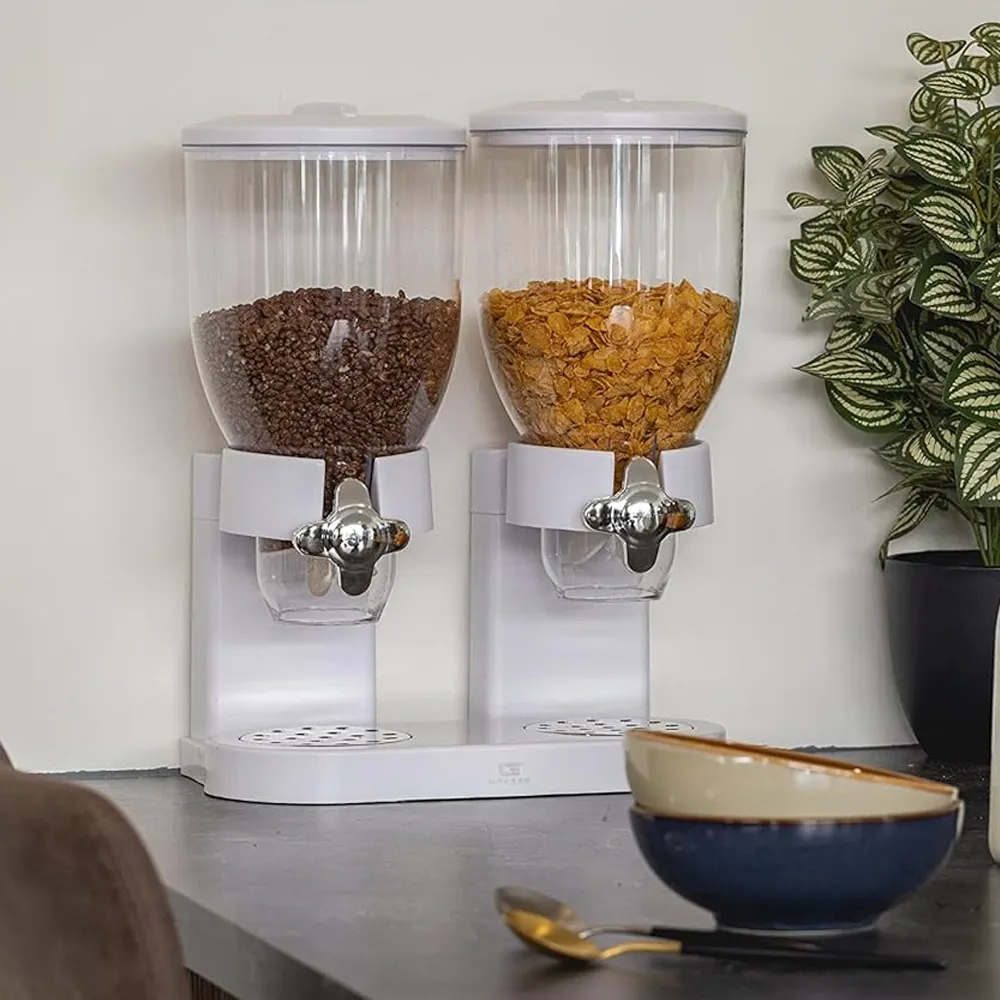 Keep your kitchen neat and your breakfast fresh with the Double Cereal Dispenser, designed for convenience and portion control. This dual-container dispenser holds up to 17.5 ounces per container, making it perfect for cereals, cornflakes, granola, and other dry foods. Made from food-grade, eco-friendly plastic, it ensures safety and maintains the freshness of your food. The scratch-resistant and shatterproof design adds durability, while removable parts make cleaning simple and hassle-free. Its compact and functional design saves space and adds a stylish touch to your kitchen counter.