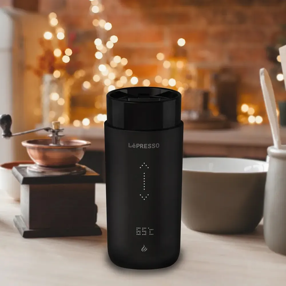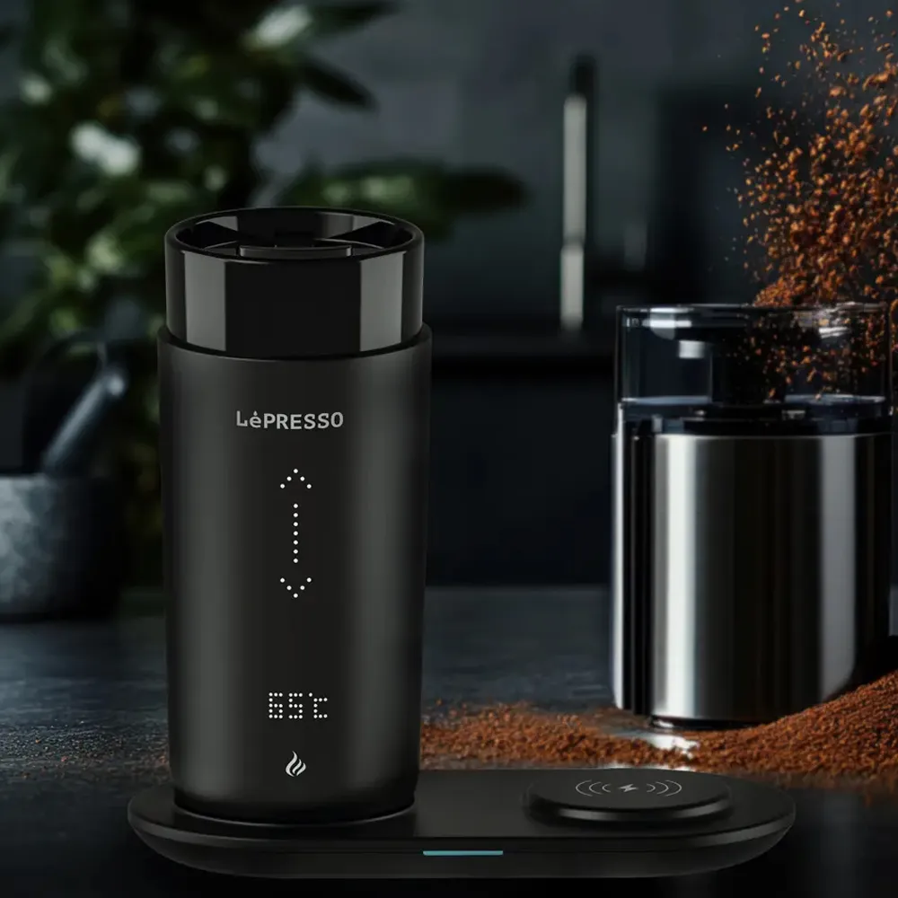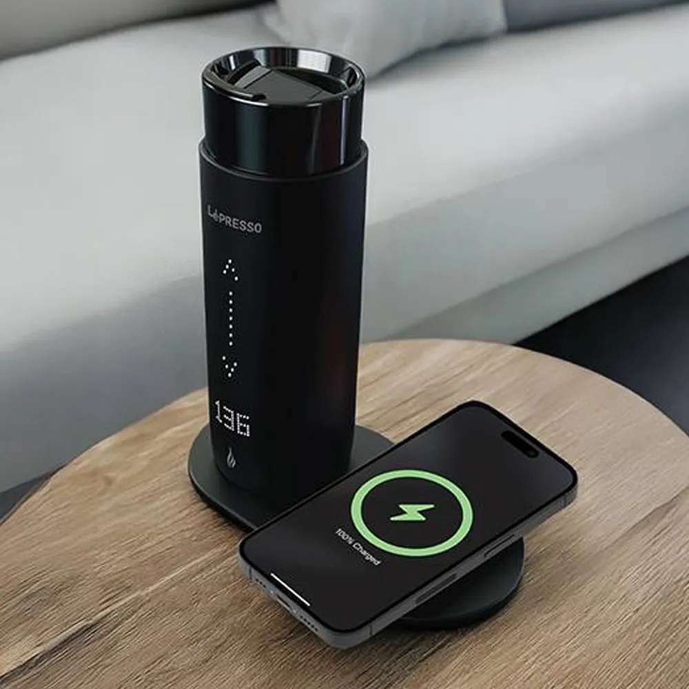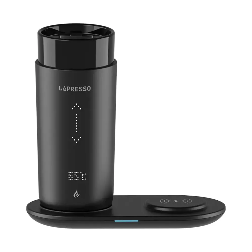 The Lepresso Smart Travel Heating Mug is designed for coffee lovers who want to enjoy their beverage at the perfect temperature anytime, anywhere. With a 355mL capacity and durable stainless steel construction with ceramic glaze, it offers both style and long-lasting performance. Its smart temperature control lets you adjust between 35°C and 65°C, while the wireless charging base adds convenience by powering your mug and other devices. A real-time temperature display ensures you always know how warm your drink is, and the leak-proof design makes it perfect for travel.