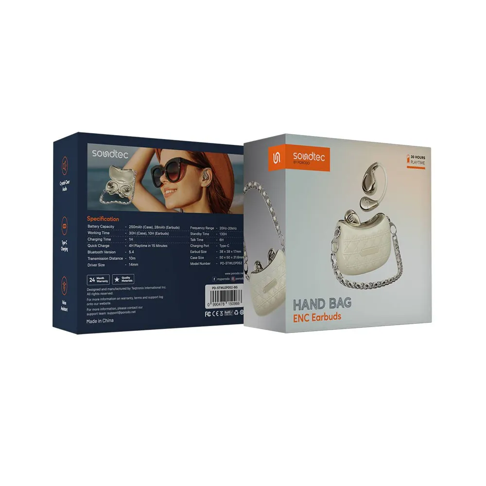 Porodo Soundtec Hand Bag ENC Earbuds with Voice Assistant, Up to 30 Hours Play Time, Fast Charge, 10m Transmission Distance, Up to 6 Hours Talk Time, Crystal-Clear Audio, Type-C Charging Port, 130 Hours Standby Time, 14mm Driver Size.