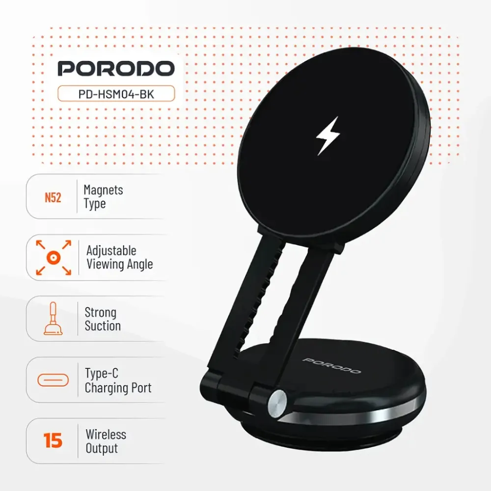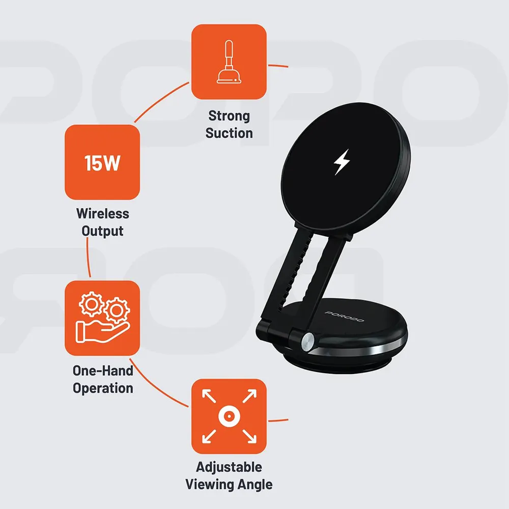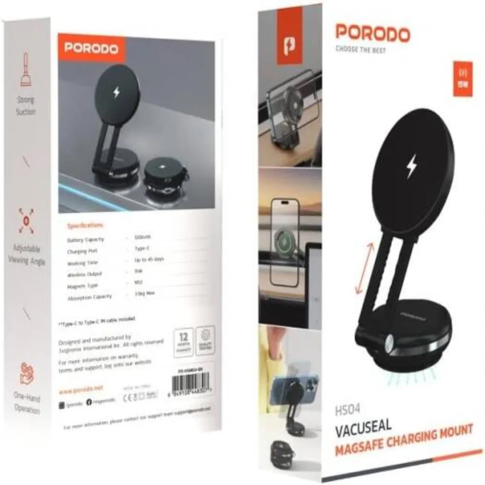 The Porodo Vacuseal Magsafe Charging Mount is a smart and reliable solution for keeping your device secure while charging on the go. With its strong N52 magnets and powerful suction, it ensures your phone stays firmly in place even on rough roads. The built-in 120mAh battery provides up to 45 days of working time, offering long-lasting convenience without frequent recharging. Supporting 15W wireless fast charging, it delivers efficient power while eliminating cable clutter. Its adjustable viewing angle allows for flexible positioning, making it ideal for navigation, video calls, or hands-free use. Combining sleek design with advanced technology, this mount is the perfect companion for modern drivers.