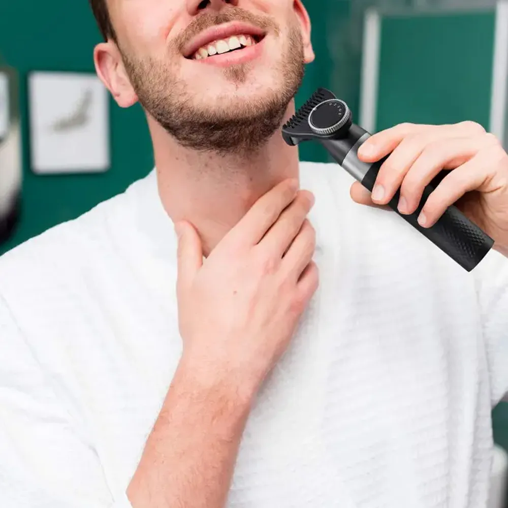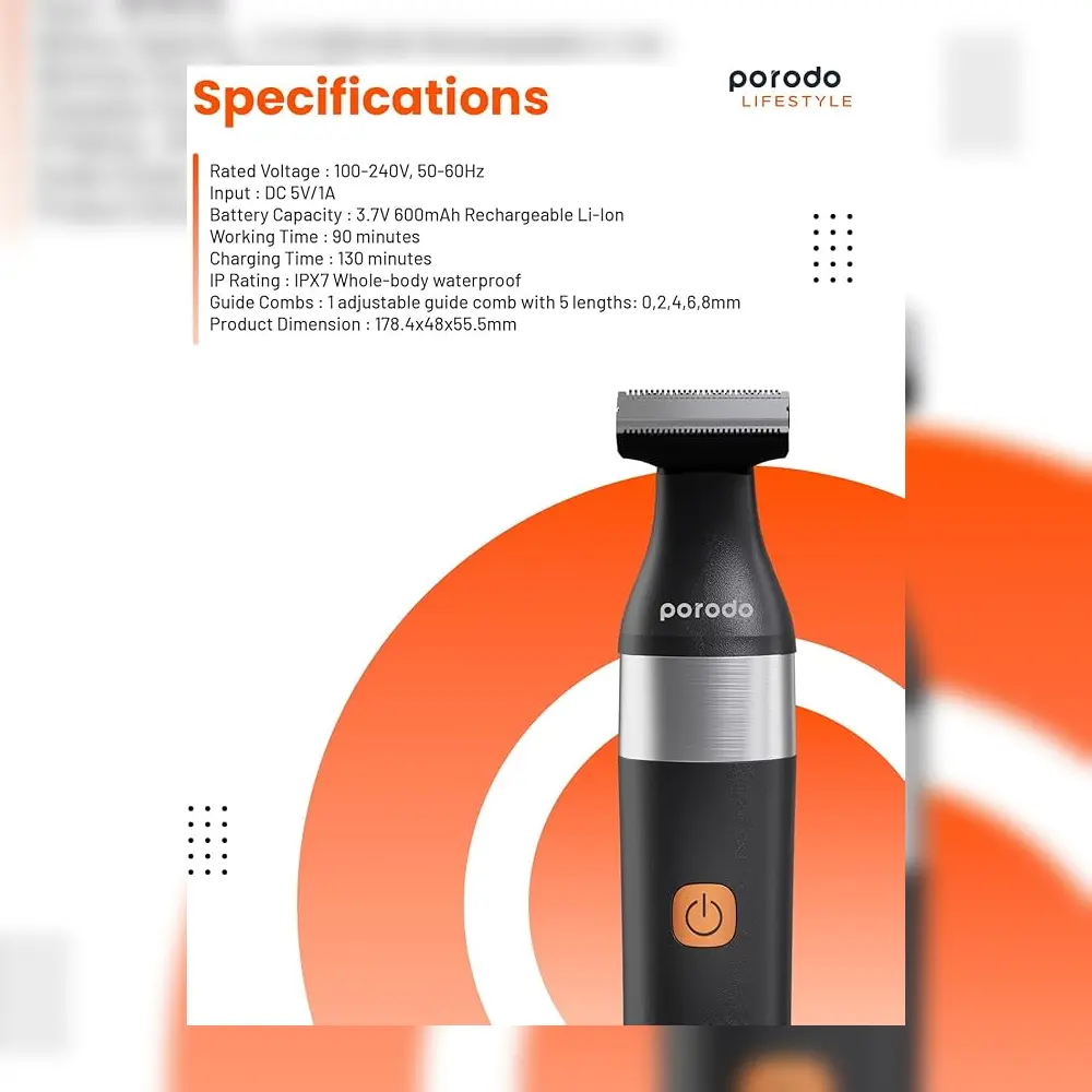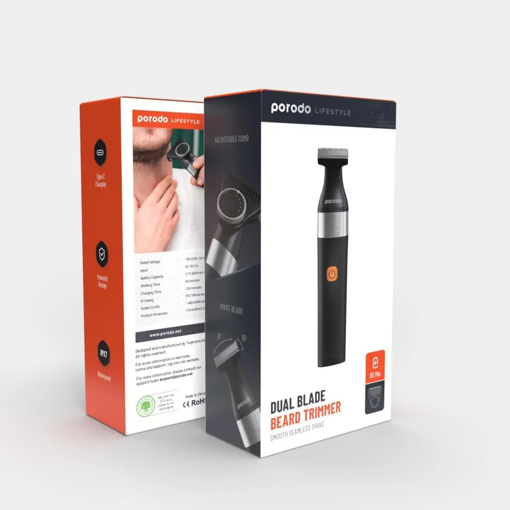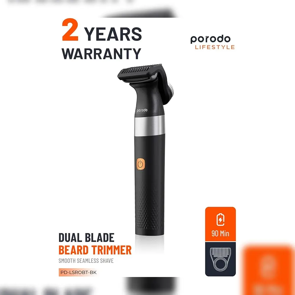 Achieve a clean, sharp look every time with the Porodo LifeStyle Dual Blade Beard Trimmer. Designed for precision and comfort, this trimmer features an adjustable guide comb with 5 length settings to suit every grooming style. Powered by a long-lasting Li-Ion battery and equipped with a Type-C charging port, it ensures up to 90 minutes of cordless use. Its ergonomic design and waterproof build make it an ideal grooming tool for home or travel.