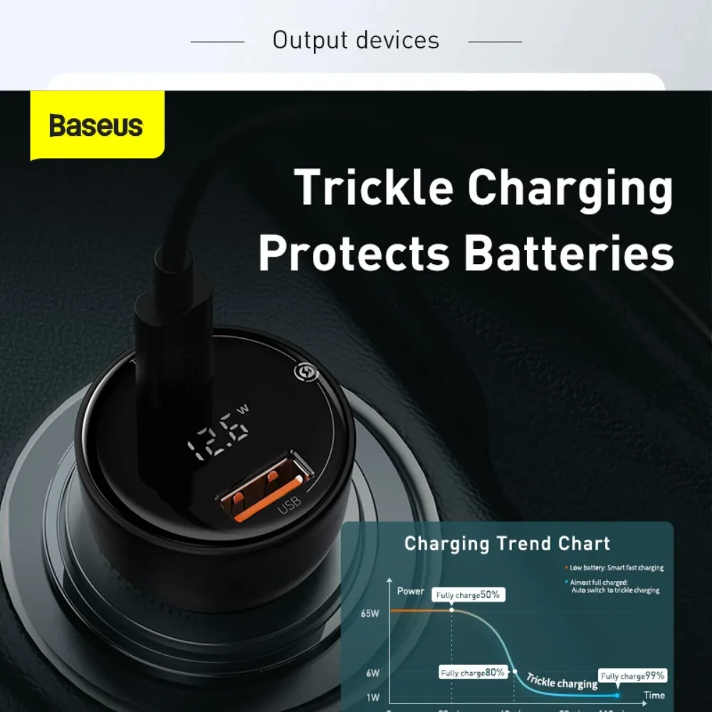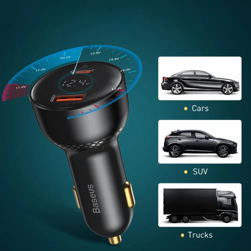 Charge your devices faster and smarter with the Baseus Superme Digital Display Car Charger. With a 100W total output and dual ports (USB + USB-C), it powers two devices simultaneously—ideal for smartphones, tablets, and even laptops. The digital voltage display gives real-time charging updates, while built-in protections ensure safe and stable power delivery. Its aluminum body and sleek design add a premium touch to your car’s interior. Compatible with both 12V and 24V sockets, it's the perfect fast-charging solution for daily commutes or long drives.