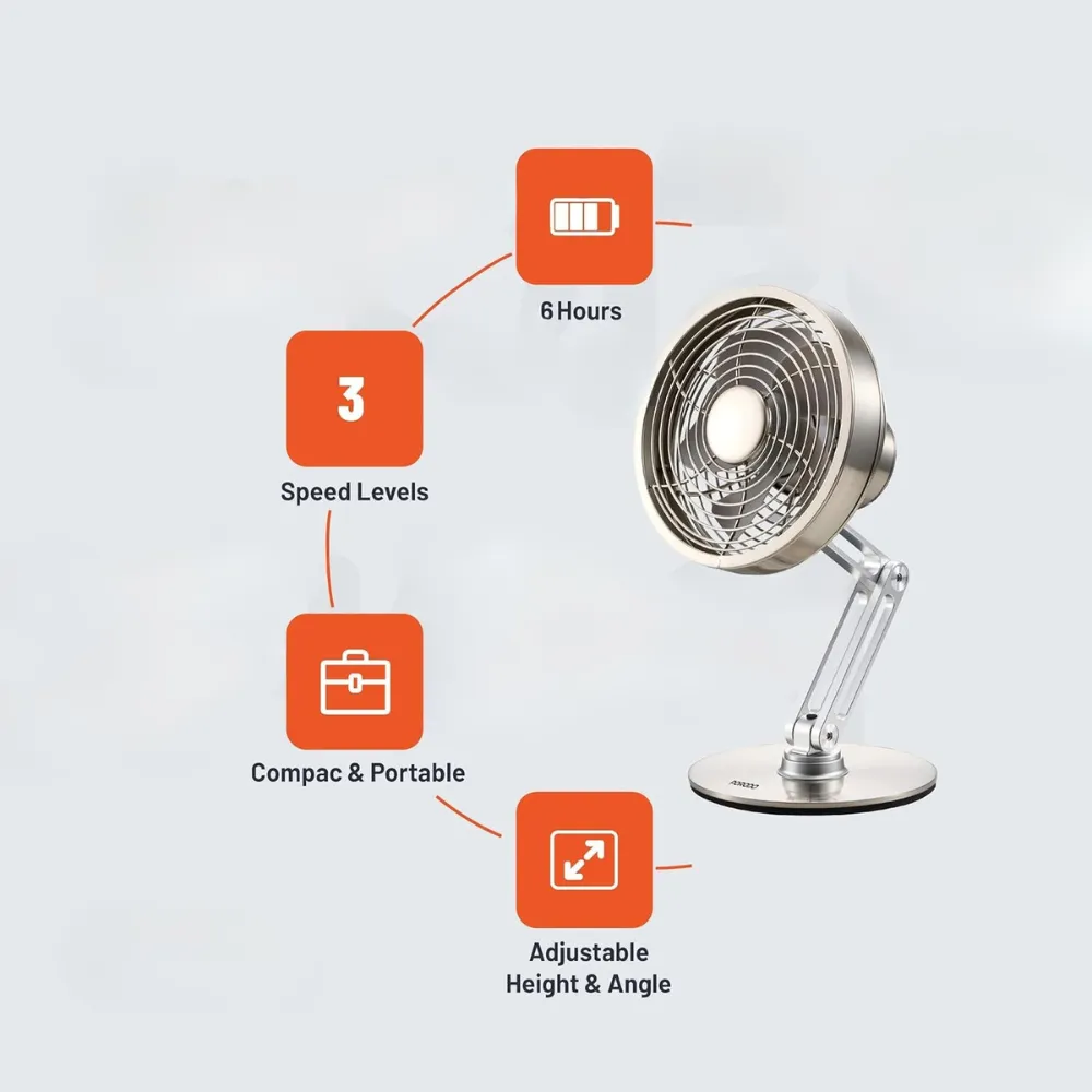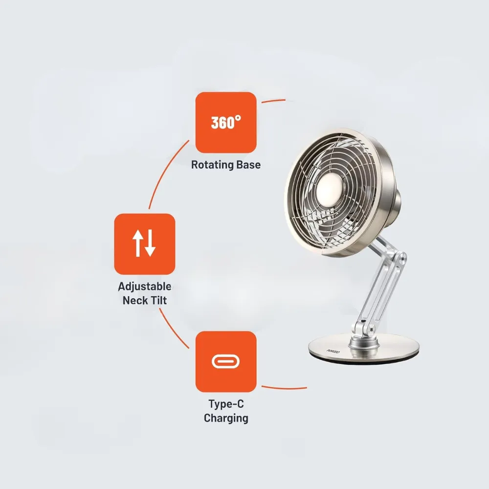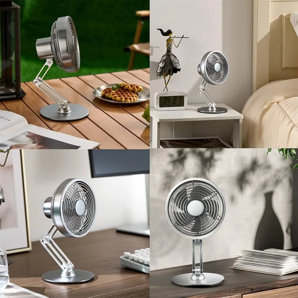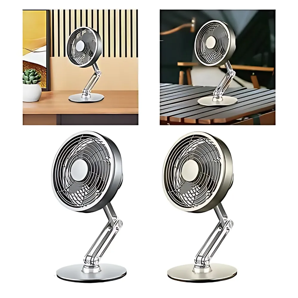 Stay cool and refreshed with the Metal Desk Fan – the perfect blend of style, performance, and portability. Its sleek metal design adds a modern touch to any space, while the rechargeable 2000mAh battery ensures up to 6 hours of wireless use. Whether you're working, relaxing, or traveling, this compact fan delivers powerful airflow with whisper-quiet operation. With 360° rotation,