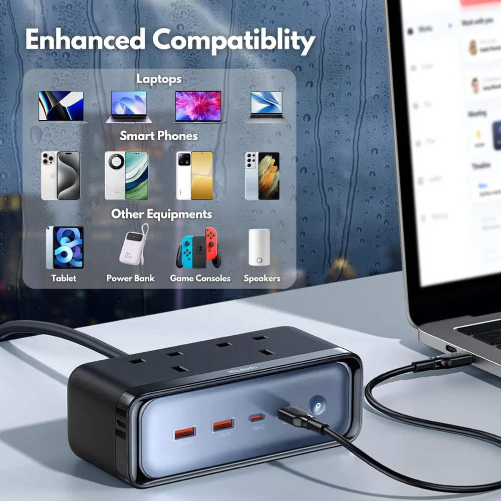 Upgrade your charging setup with the Mcdodo 6-in-1 Fast Charging Power Strip, engineered to power up all your devices quickly and safely. This multiport extension cord features 2 USB-C ports (100W max), 2 USB-A ports (18W max), and 2 AC outlets (13A max) — all packed into a compact, stylish unit with a 1.5-meter cord and UK plug.
