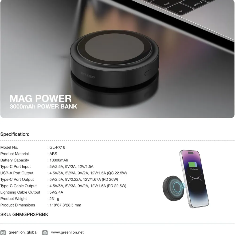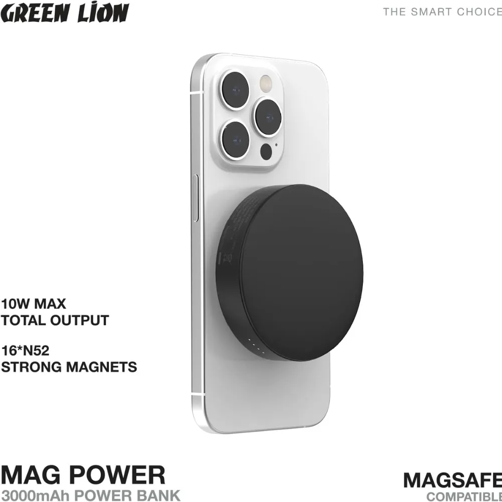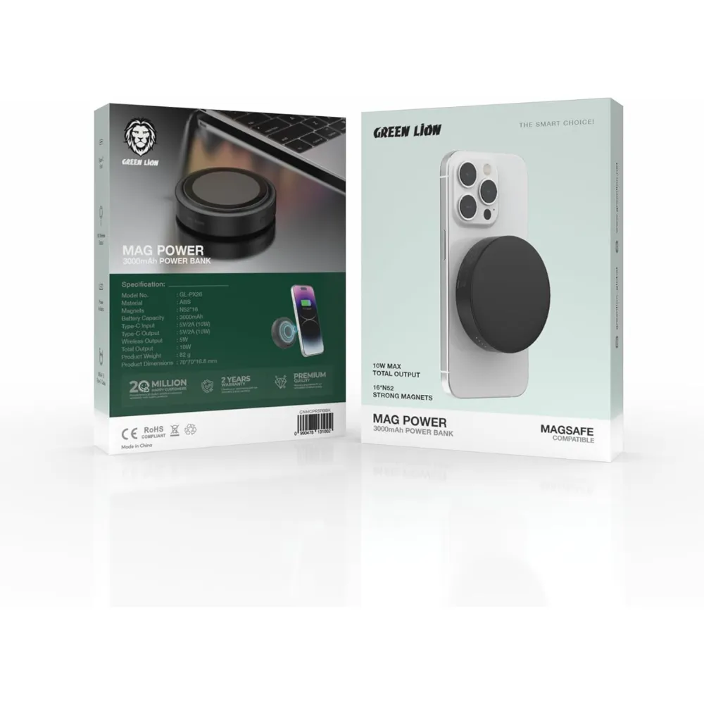 Experience convenient on-the-go charging with the Green Lion MAG Power 3000mAh Power Bank. Designed for seamless compatibility with MagSafe devices, it features strong N52*16 magnets for secure attachment and a total 10W output for fast and efficient charging. With a compact build, LED power indicator, and USB-A to Type-C cable included, this power bank delivers functionality, portability, and style in one powerful package.