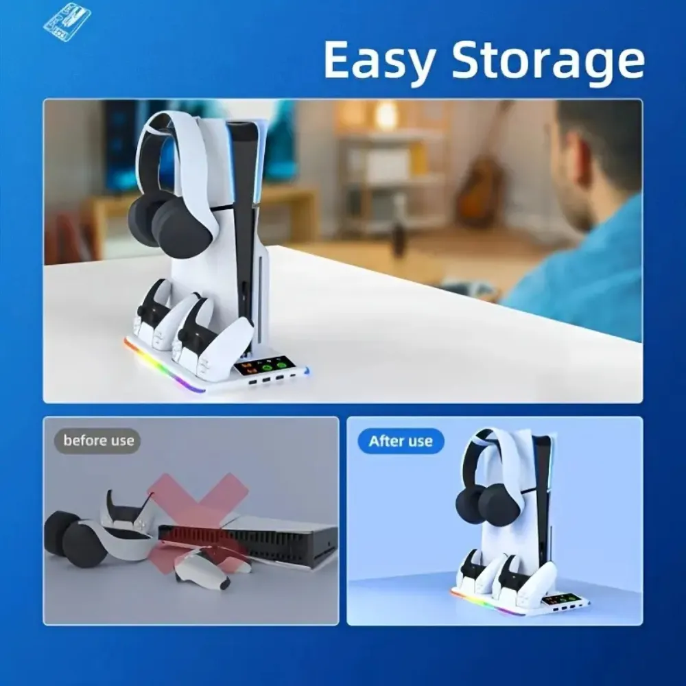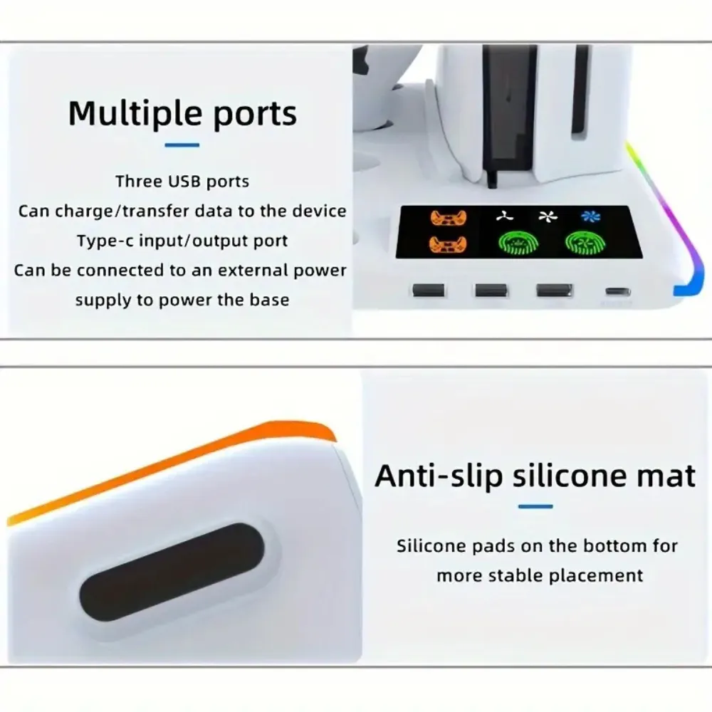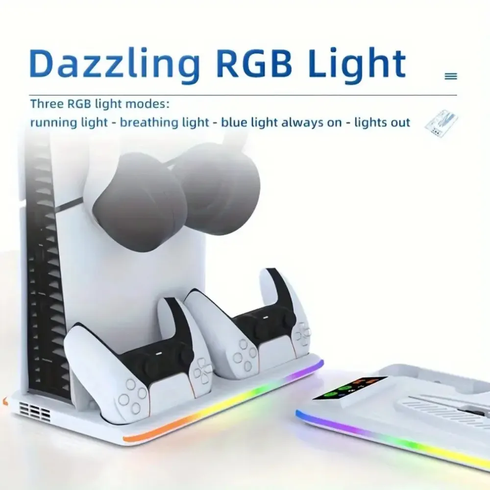 Optimize your PlayStation 5 setup with the Multifunctional Cooling Stand, built for PS5, PS5 Slim, and PS5 Pro consoles. Featuring an integrated RGB LED charging station for DualSense controllers, a powerful 3-level cooling fan, and universal compatibility, this all-in-one station offers efficient heat dissipation and organized storage. With its clean white finish and sturdy ABS construction, it complements your console’s aesthetic while enhancing performance and gameplay convenience.