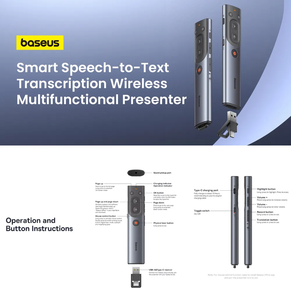 Make your presentations seamless and professional with the Baseus Wireless Presentation Remote. Designed for presenters, educators, and business professionals, this sleek remote features intuitive controls for slide navigation, a red laser pointer for emphasis, and a built-in mouse function for added versatility. Its USB receiver ensures stable connectivity, while the rechargeable Type-C port supports long-lasting battery life, making it perfect for frequent users.