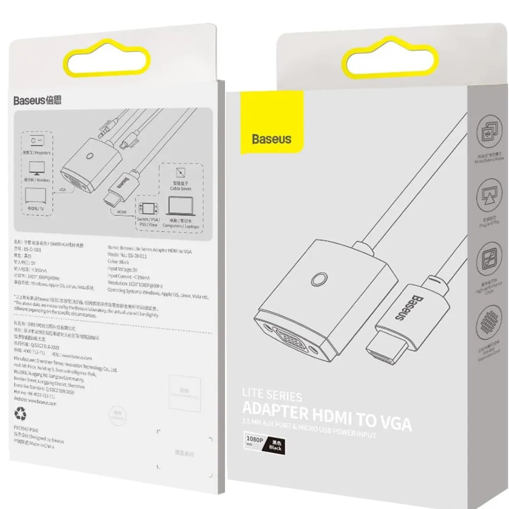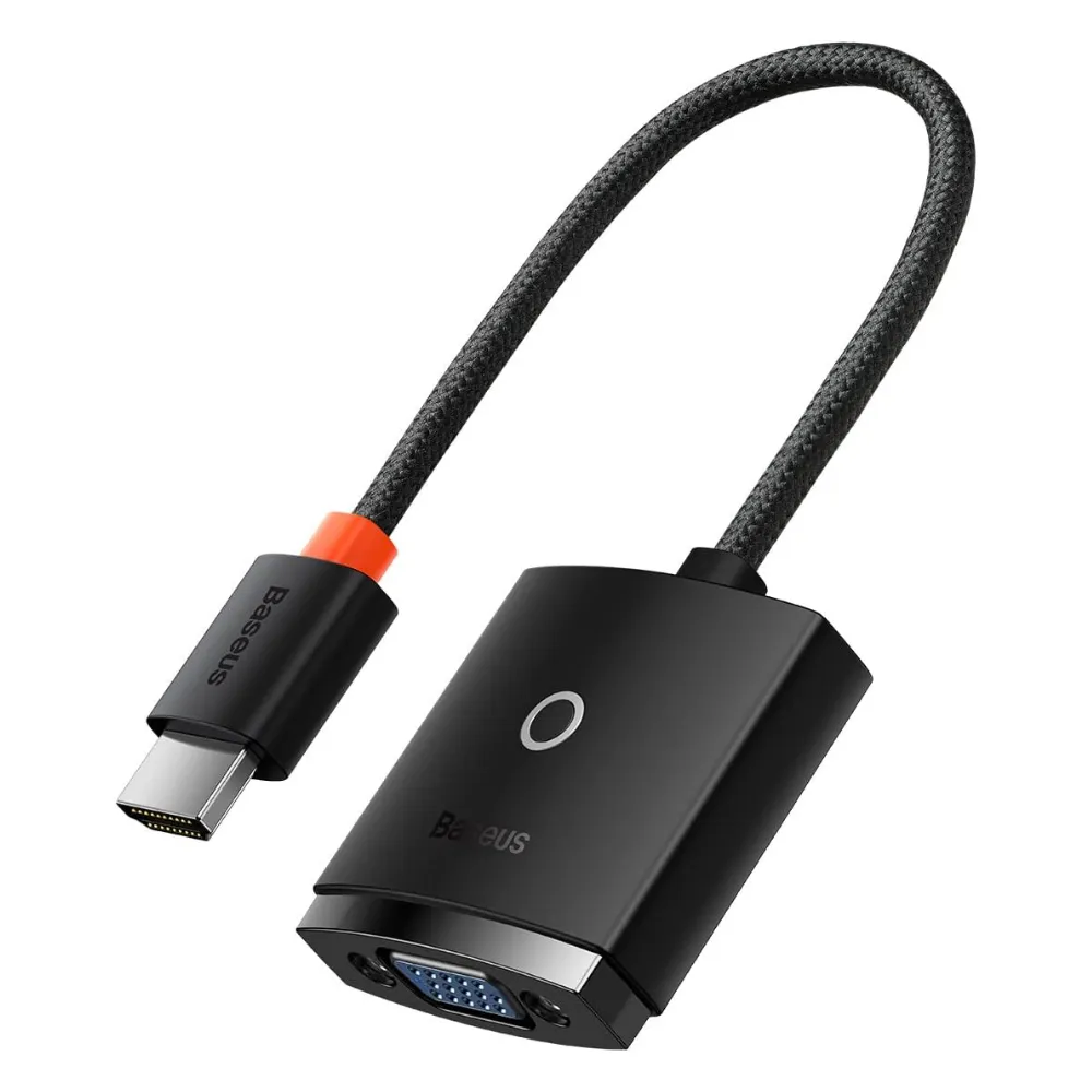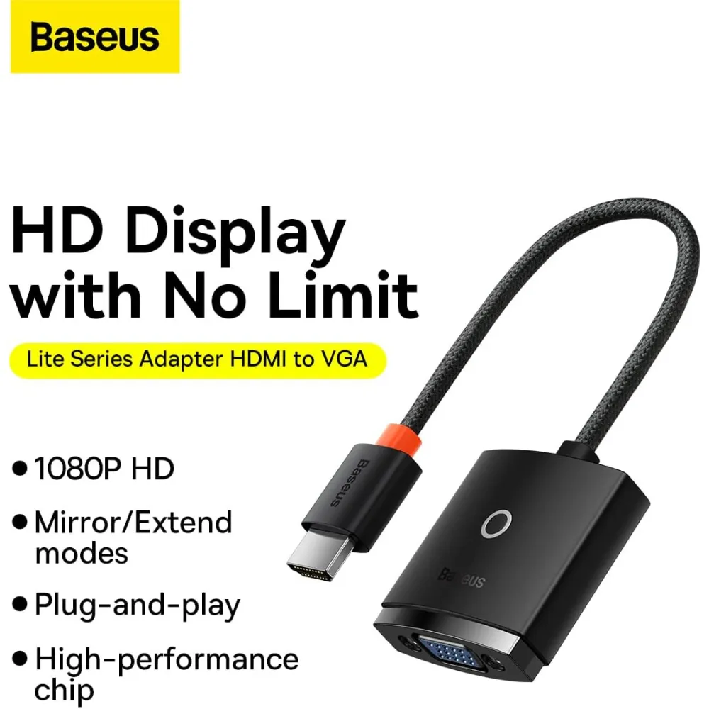 Connect your HDMI devices to older VGA displays with the Baseus Lite Series HDMI to VGA Adapter. This compact, matte black adapter supports Full HD 1080P resolution and comes with a 3.5mm audio output and Micro USB power input for stable performance. Ideal for presentations, streaming, or dual-display setups, it ensures broad compatibility with laptops, projectors, and monitors.