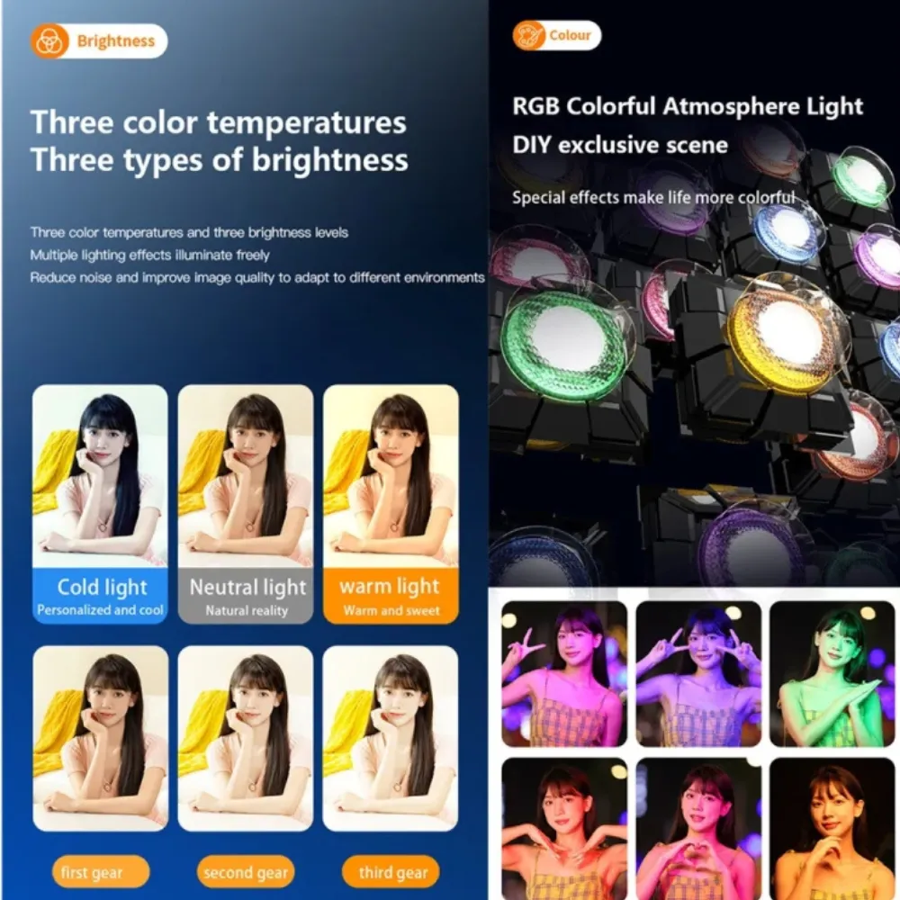 Bring professional lighting to your content creation with the compact and powerful D2 Pro Mini RGB Fill Light. Designed for vloggers, live streamers, and mobile photographers, this versatile light features 60 white/yellow LEDs and 22 RGB beads, delivering 24 vibrant scene modes and adjustable color temperatures for any mood or setting. The built-in foldable phone holder supports both horizontal and vertical shooting, while the soft nano-diffused light ensures even, eye-friendly illumination. Lightweight and pocket-sized, it’s perfect for travel or on-the-go shooting. With a 1000mAh battery offering up to 12 hours of usage and Type-C charging, this light is a must-have tool for creators who value flexibility and performance.