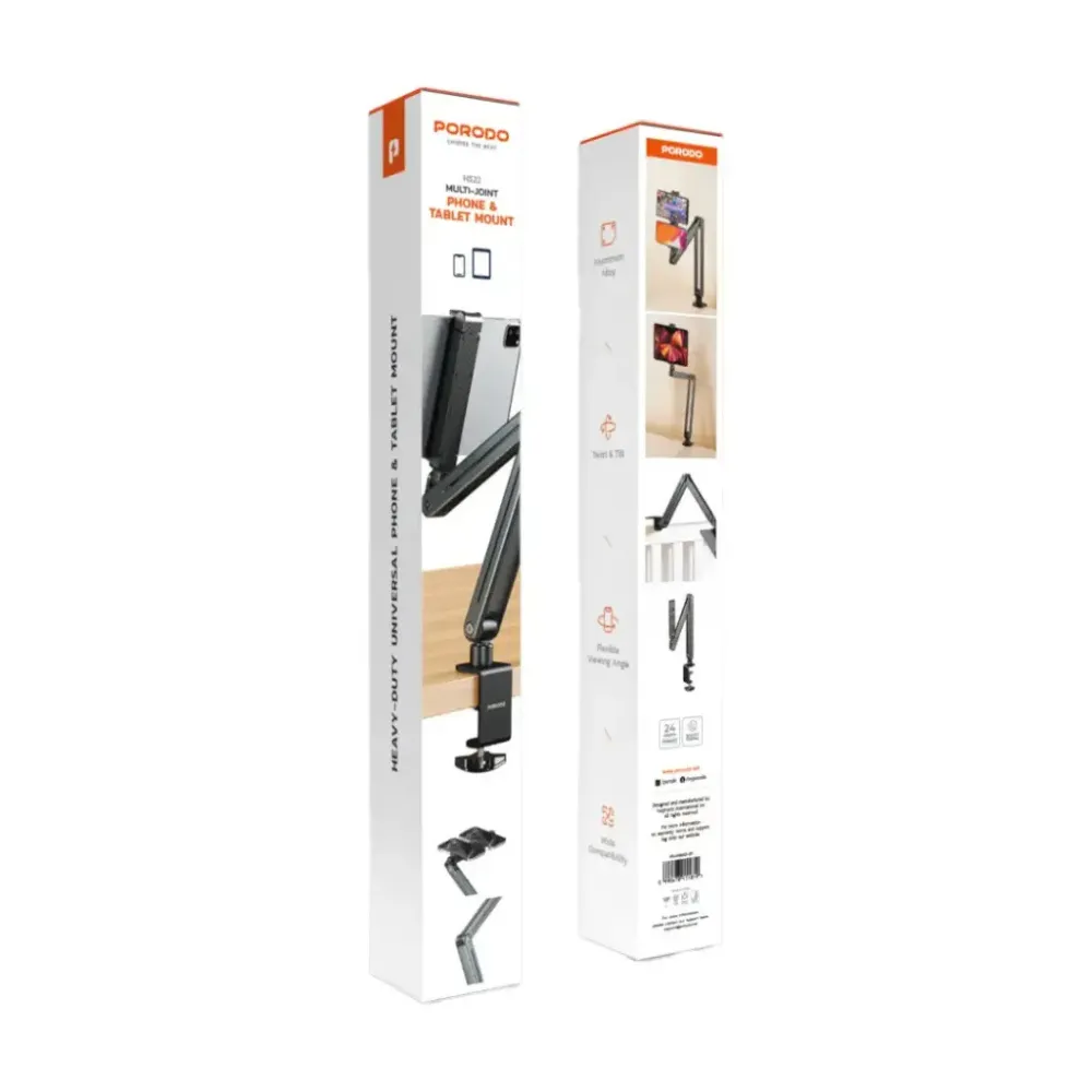 Enhance your viewing comfort with the Porodo Multi-Joint Phone & Tablet Mount. Built from durable yet lightweight aluminum alloy, this mount offers twist and tilt functionality to help you achieve the perfect angle for video calls, streaming, reading, or working. Its sleek, compact design is ideal for both home and office use, delivering stability, flexibility, and hands-free convenience.