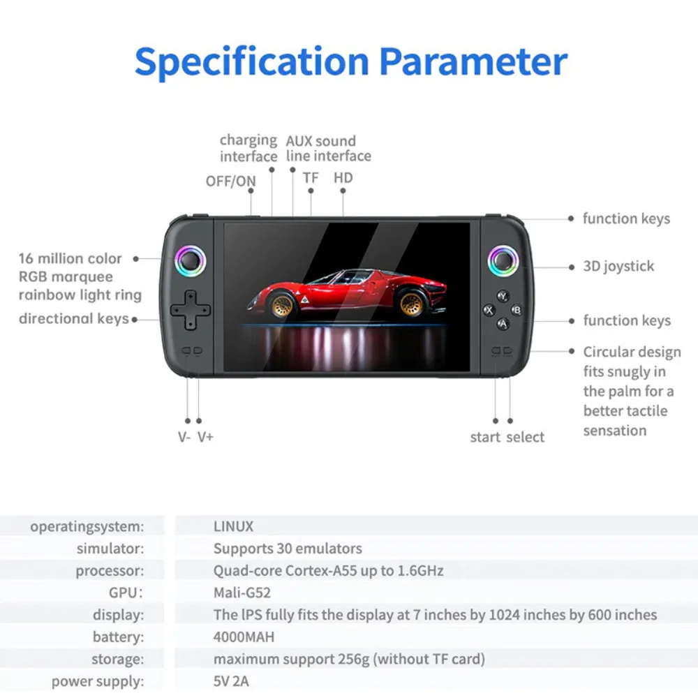 Game on-the-go with the SJGAM M27 Handheld Gaming Console, a versatile portable device powered by a Quad-core Cortex-A55 processor and Mali-G52 GPU. Supporting over 30 emulators, it brings retro and modern gaming to your fingertips with a 7-inch HD display. With a long-lasting 3000mAh battery and Linux OS, it offers seamless gameplay, large storage capacity, and an intuitive interface for all ages. Perfect for gamers who crave flexibility and fun, anytime, anywhere.