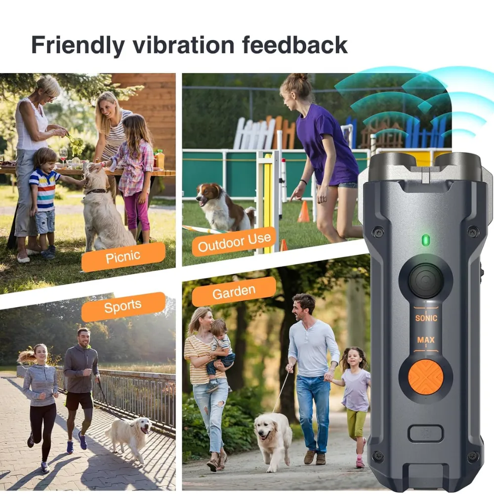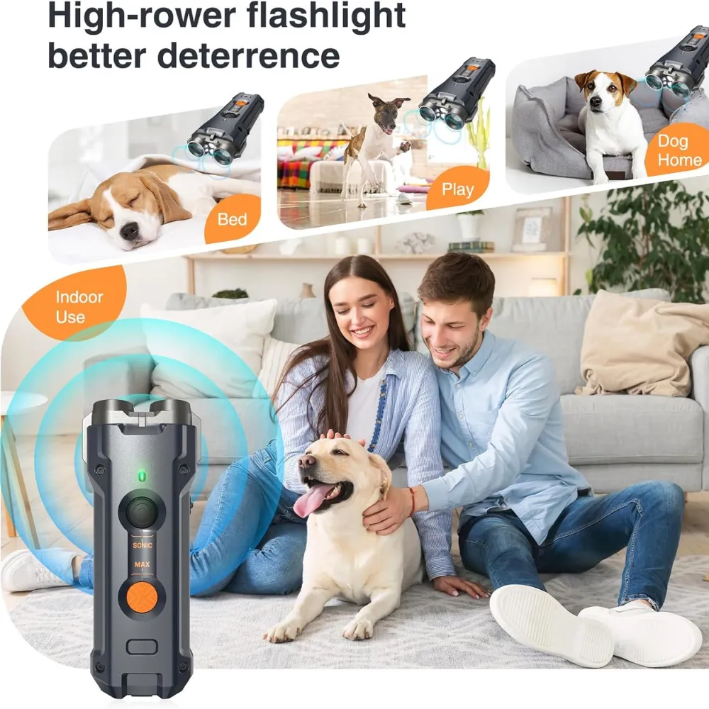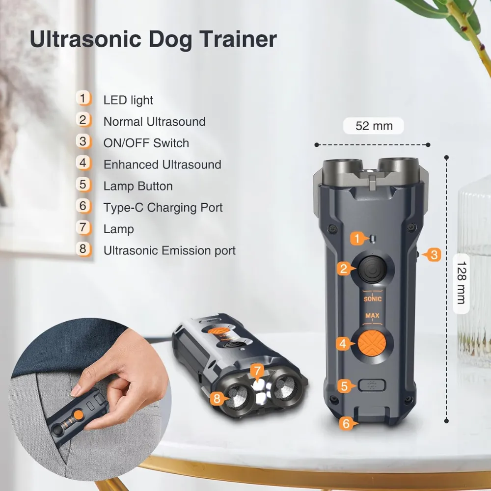 Train your dog safely and effectively with the Antibarking Ultrasonic Dog Repeller. Using advanced 25kHz ultrasonic technology, it helps stop excessive barking without harming your pet. Featuring two deterrent modes and a built-in LED flashlight, this compact device works up to 30 feet away, making it perfect for indoor or outdoor training. With a quick 2-hour USB-C recharge and up to 30 days of battery life, it’s a reliable solution for correcting unwanted behaviors anytime, anywhere.