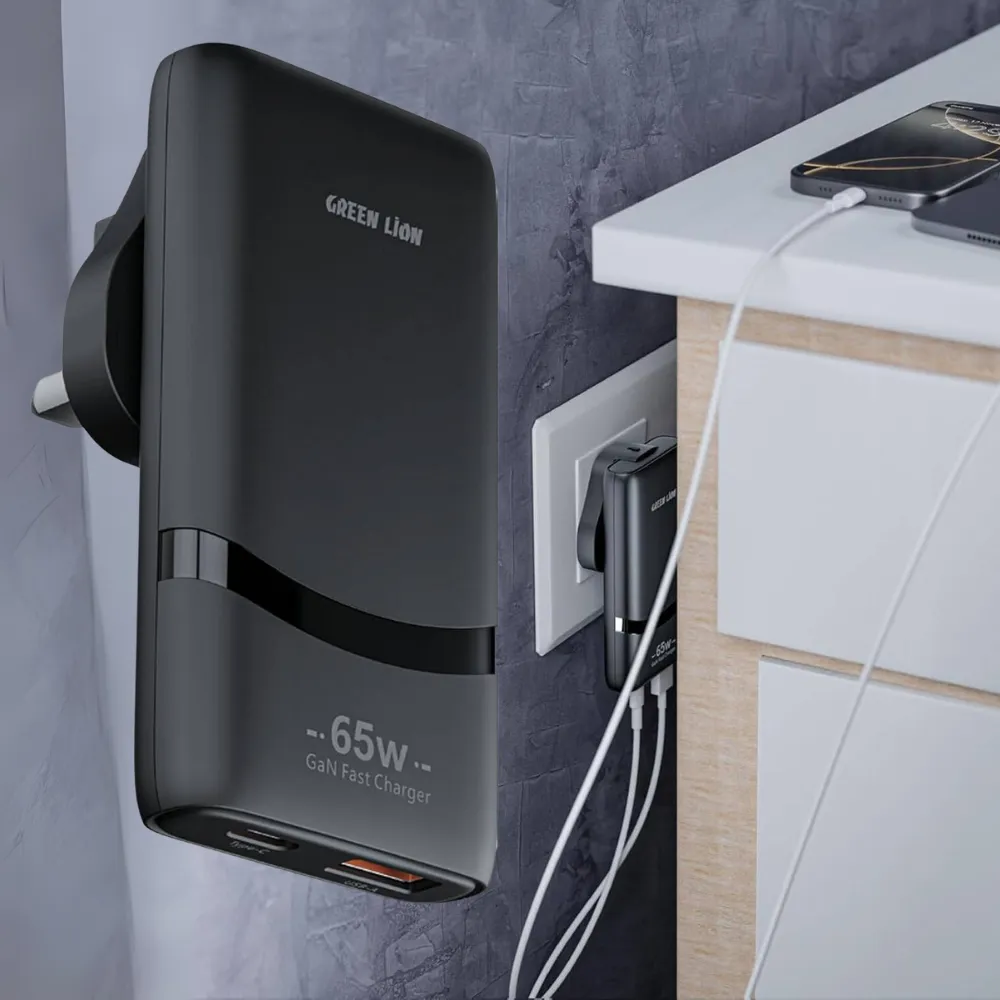 Power your devices faster and smarter with the Green Lion 65W GaN Adapter. Built with advanced GaN technology, this compact and energy-efficient charger delivers up to 65W output, ensuring rapid charging for laptops, tablets, and smartphones. Featuring both Type-C and USB-A ports, it supports PPS 60W fast charging, taking your device from 0–50% in just 30 minutes. Safety is prioritized with flame-retardant PC material, protecting against overheating and overcharging. With its UK plug design and universal compatibility, this adapter is the perfect solution for home, office, and travel use.